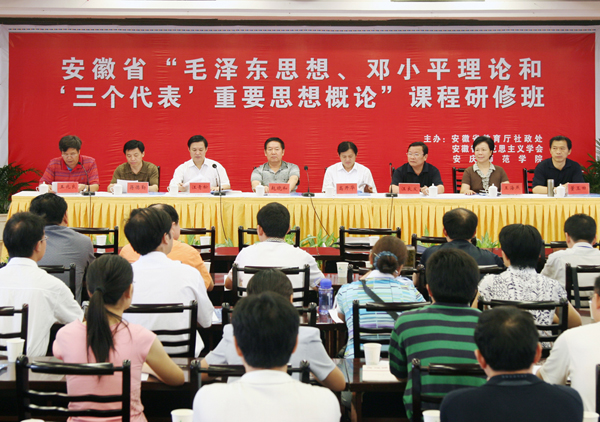7月23日上午,由安徽省教育厅社政处、安徽省马克思主义学会、安庆师范学院联合主办的安徽省“毛泽东思想、邓小平理论和‘三个代表’重要思想概论”课程研修班在beat365隆重举行。中共安徽省委教育工委高开华副书记,黄山学院党委书记汪良发,安徽科技学院党委副书记蒋德勤,安徽省委讲师团副团长董玉田,安徽省马克思主义学会常务副会长、秘书长王兆良教授等专家应邀出席大会开幕式。