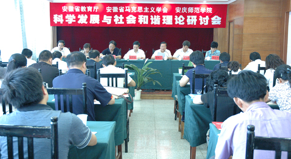 7月24日下午,由安徽省教育厅、安徽省马克思主义学会、安庆师范学院联合主办的“科学发展与社会和谐”理论研讨会在beat365隆重举行。安徽省马克思主义学会会长、安庆师范学院党委副书记、院长汪青松教授,黄山学院党委书记汪良发,安徽省马克思主义学会常务副会长、秘书长王兆良教授,安徽省马克思主义学会副会长、安徽工程科技学院宣传部部长苏国红教授,安徽省马克思主义学会副会长、安徽大学政治学系主任方爱东教授等专家出席大会。安徽省教育厅社政处刘新跃处长应邀出席会议。来自全省各兄弟院校的六十余专家、学者参加了研讨会。会议由安庆师范学院政法学院副院长焦少林教授主持。