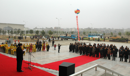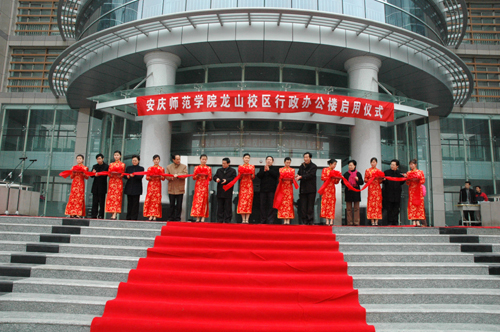 在锣鼓和礼炮声中,全体校领导为行政办公楼启用剪彩。