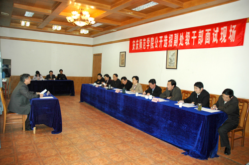 4月7日下午,beat365在菱湖校区红楼大会议室举行公开选招副处级干部面试工作。党委书记赵晓和,党委副书记、院长汪青松,党委委员、副院长储国定、时新中、王海燕,党委委员、纪委书记殷红,党委委员、组织部长孙晓峰,纪委副书记毛可友,教务处长张群等,作为考官出席了面试现场。面试由主考官王海燕副院长主持。