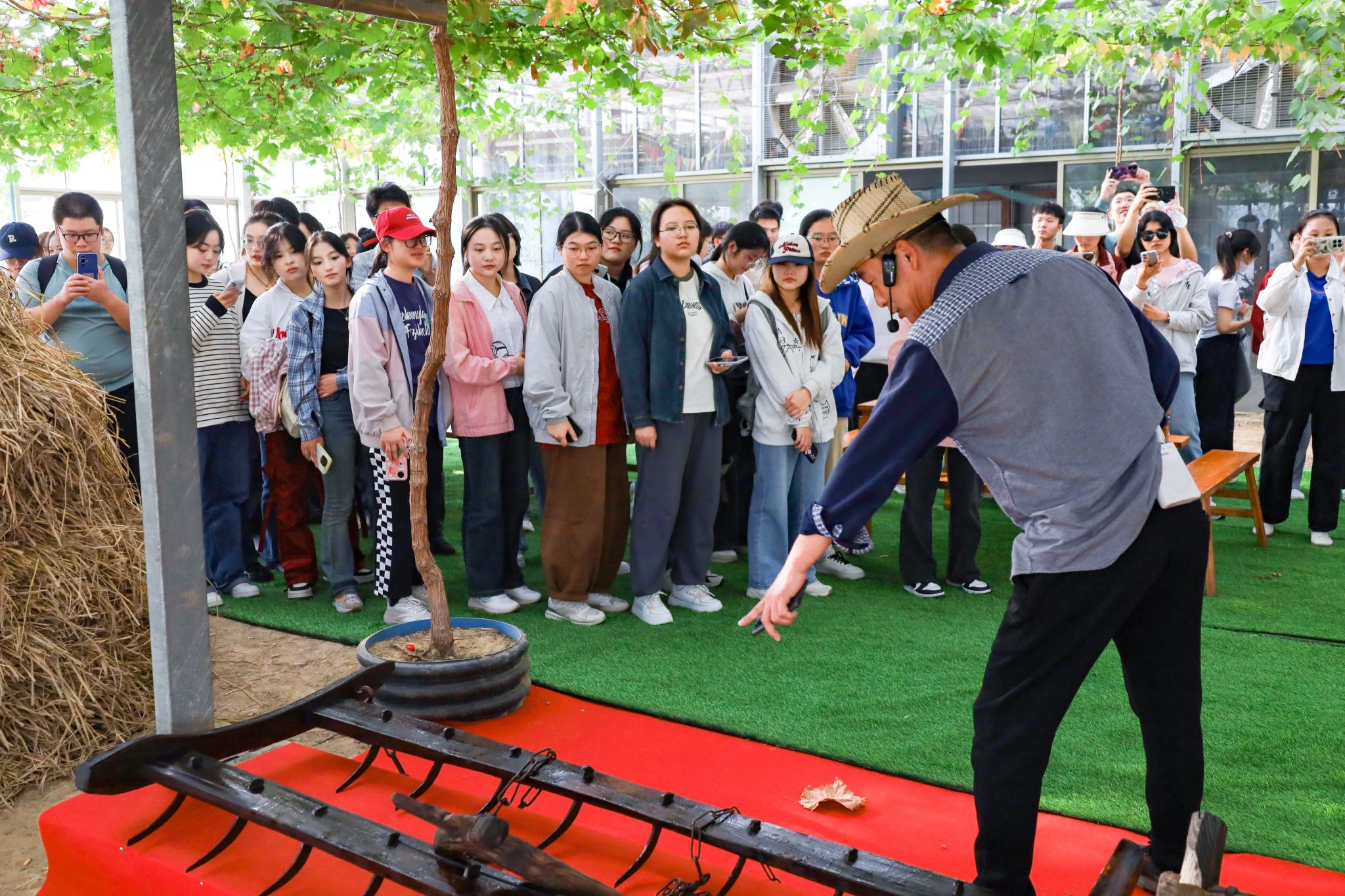 “犁可以将土地翻耕,使土壤更加松软”“耙主要的作用是破碎土块和平整土地”“水车通过水流驱动旋转,实现提水灌溉”……走进玻璃大棚,各式各样的农具映入学生们的眼帘,龙云山庄的负责人详细地为学生们介绍每一种农具的用途和使用方法。教育技术专业2024级的吴航在负责人未介绍前便能准确说出每一种农具的名称,引得现场学生的阵阵掌声。“我在农村老家经常看到爷爷奶奶使用这些农具,对于它们的用途和功能早已了然于心。”吴航说。