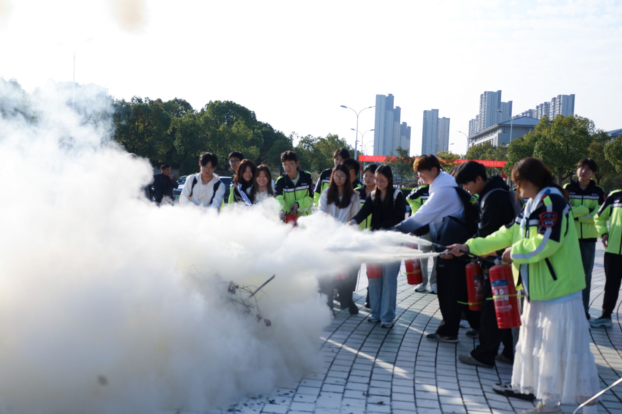 当第一声警报响起,各班级辅导员迅速组织学生紧急避震,同学们迅速抱头,用双手保护头颈,蜷曲身体,降低身体重心,躲在课桌下或教室内墙角处。30秒后,立即进入火灾疏散演练环节,同学们低头弯腰,穿过浓烟弥漫的“火场”,按照疏散路线依次、快速撤离到广场。“只见浓烟滚滚,场面令人震撼,我真真切切地感受到了火灾的危险与逃生的紧迫。通过这样的演练,以后无论在家还是在校,倘若真的出现火情,我坚信自己一定能够冷静应对。”生命科学学院石旌男同学说到。学生校卫队董康宁同学参与火灾疏散引导,她表示,“为尽量还原火场的情况,我们在楼道处、出口处释放了消防演习烟雾弹。我们在各楼梯口引导同学们有序疏散,各小组密切协作,整个演练过程做到了安全、快速、有序。”