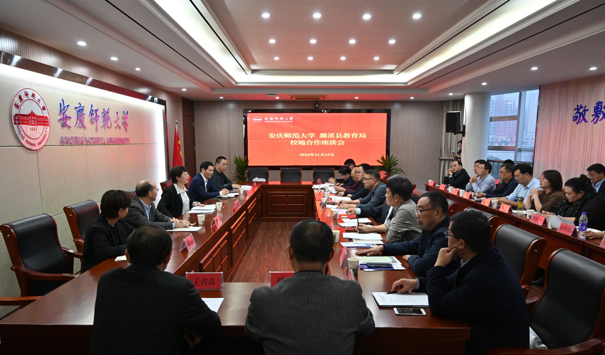 11月15日,濉溪县教育局党组成员、濉溪县教育局督导室主任、临涣中学党总支书记李想一行13人来校考察调研。校长彭凤莲主持座谈会。服务经济社会发展处、教务处、招生考试中心、继续教育学院等部门负责人,各师范专业分管教学院长参加座谈会。