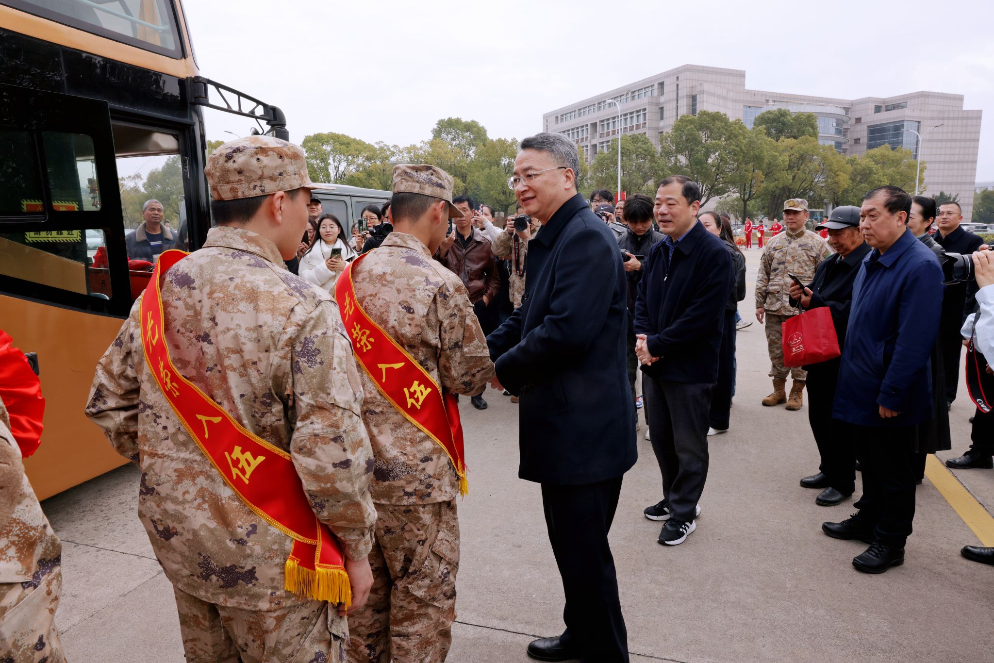 校党委书记李福华等领导与嘉宾、入伍大学生一同挥锹铲土、扶苗浇水,在“强军林”栽下一棵棵树苗。李福华与新兵们亲切交谈,询问他们的入伍感受和未来规划,鼓励他们在部队中锤炼坚毅品格,练就过硬本领,为实现强军目标贡献力量。新兵们精神抖擞,干劲十足,他们纷纷表示,一定会牢记嘱托,不辱使命,以钢铁般的意志扎根军营,以青松般的姿态坚守战位,用热血忠诚续写新时代革命军人的荣光。家长们纷纷举起手机记录下眼前的一幕幕,内心的不舍让不少家长红了眼眶。由退役复学大学生组成的国旗护卫队学生分列大路两侧行举枪礼欢送入伍新兵。