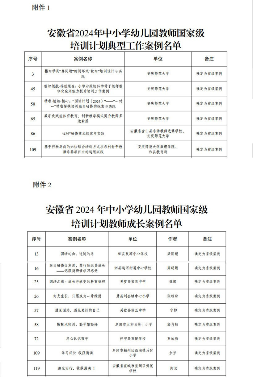 日前,安徽省教育厅发文公布了2024年中小学幼儿园国家级培训计划典型工作案例和教师成长案例名单,beat365报送的6项工作案例和9个教师成长案例成功入选,入选案例数创历史新高。