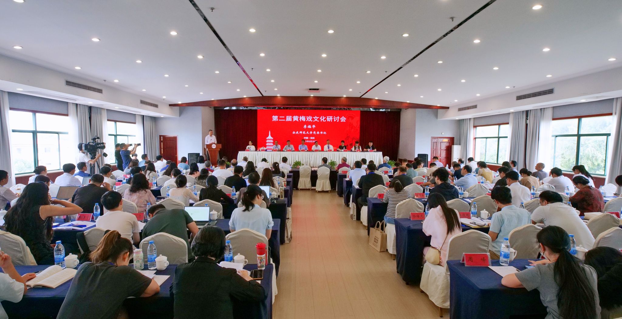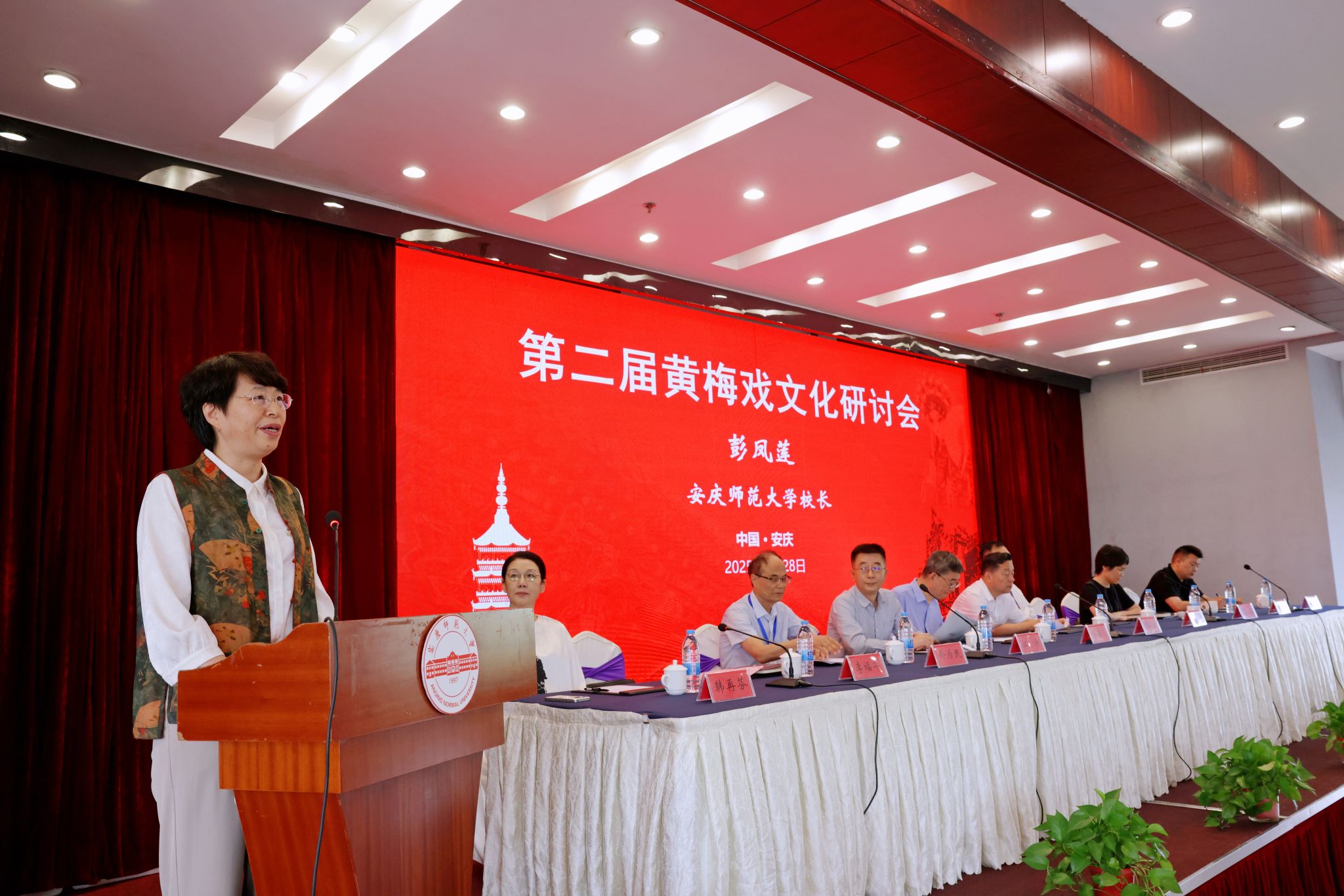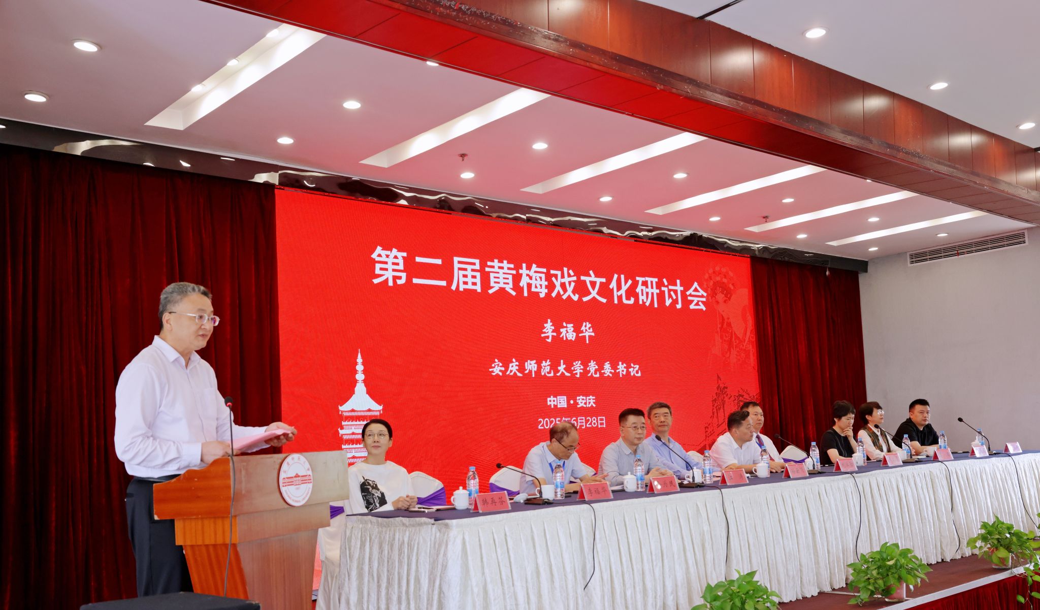 6月28日,学校主办第二届黄梅戏文化研讨会,深入学习贯彻习近平文化思想和习近平总书记考察安徽重要讲话精神,推动中华优秀传统文化创造性转化、创新性发展。安徽省政协党组副书记、副主席孙云飞,中共安徽省委教育工委委员、安徽省教育厅副厅长刘业勋,安徽省社会科学界联合会一级巡视员江涛,校党委书记李福华,校长彭凤莲,安庆市人民政府副市长李岩等出席开幕式。中国戏剧家协会、中共安徽省委宣传部、中共安庆市委宣传部和安庆市文化和旅游局,以及来自东南大学、同济大学、中国戏曲学院、中国音乐学院、山东艺术学院、华东师范大学、南京师范大学、福建师范大学、上海师范大学、信阳师范大学、温州大学、北方工业大学、广东财经大学、湖北演艺集团、河南省文化艺术研究院、安徽省艺术研究院、黄山学院、安徽黄梅戏艺术职业学院、安庆市黄梅戏(地方戏曲)研究院、安庆市文化旅游产业发展集团有限公司等机构的140多位领导、专家学者、演艺人员和企业界人士参加会议。李福华主持开幕式与闭幕式。