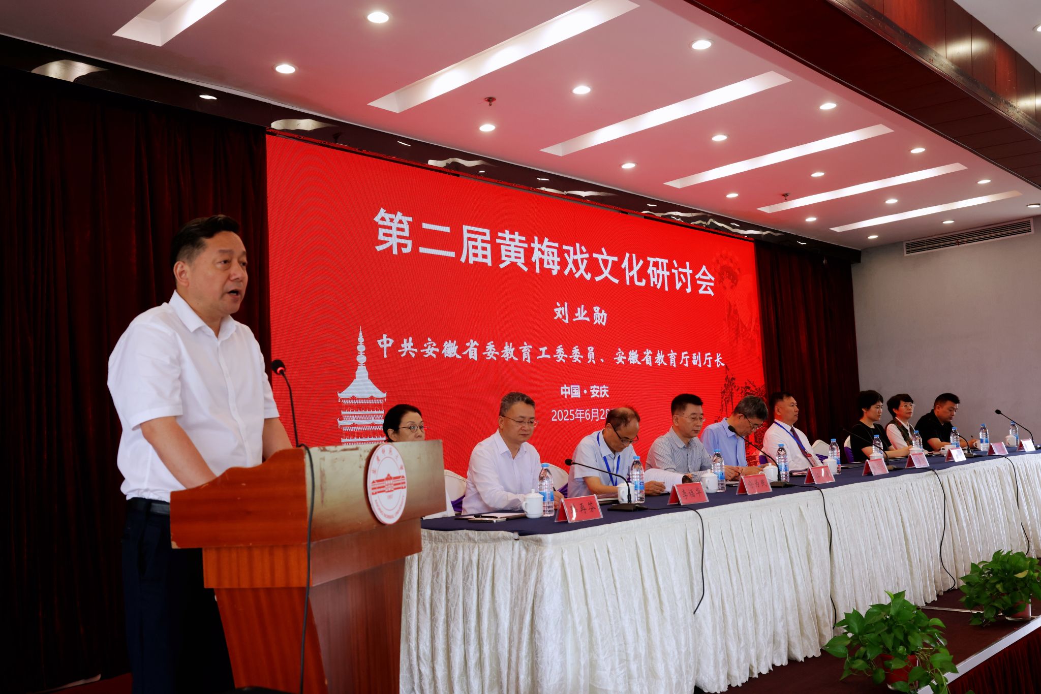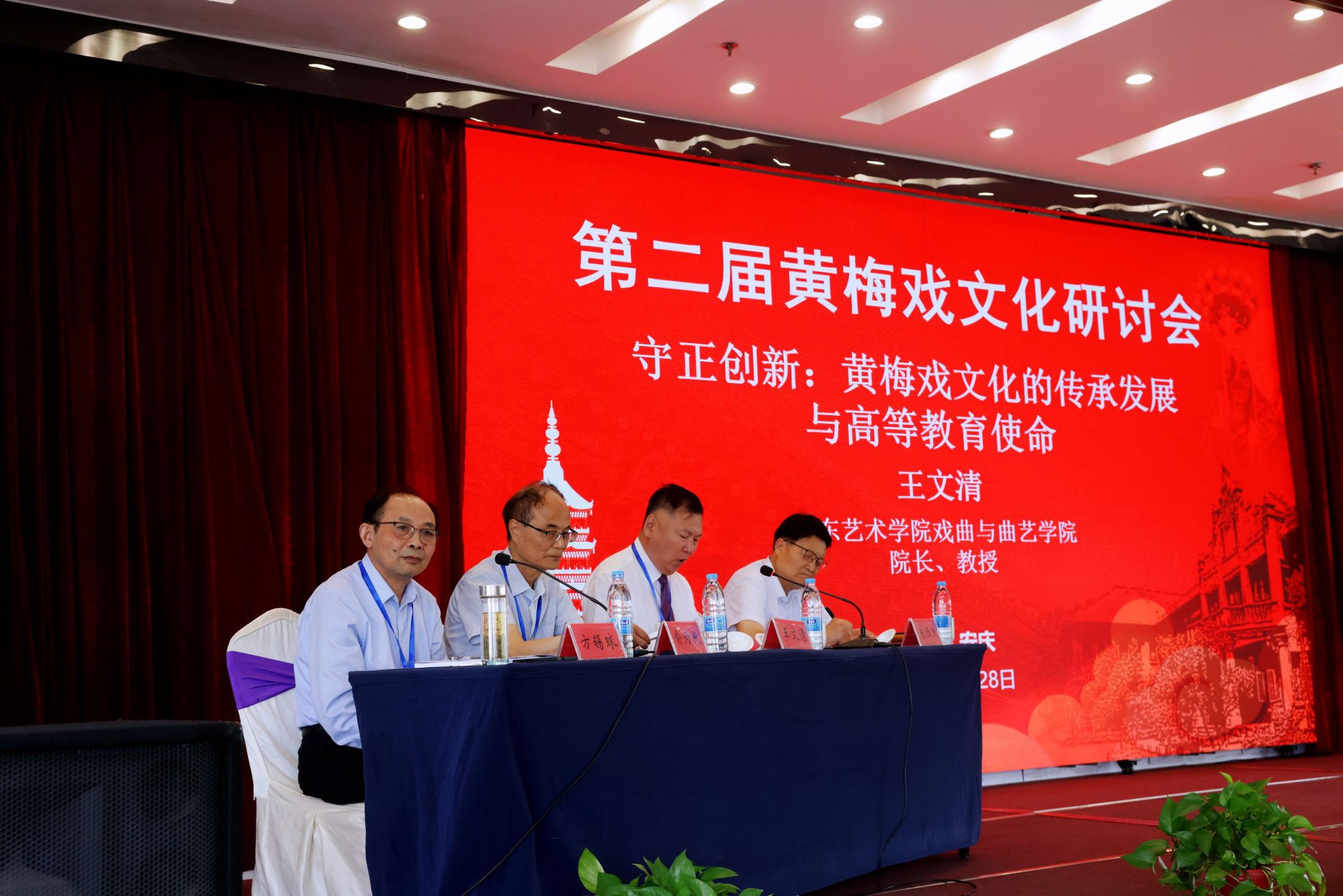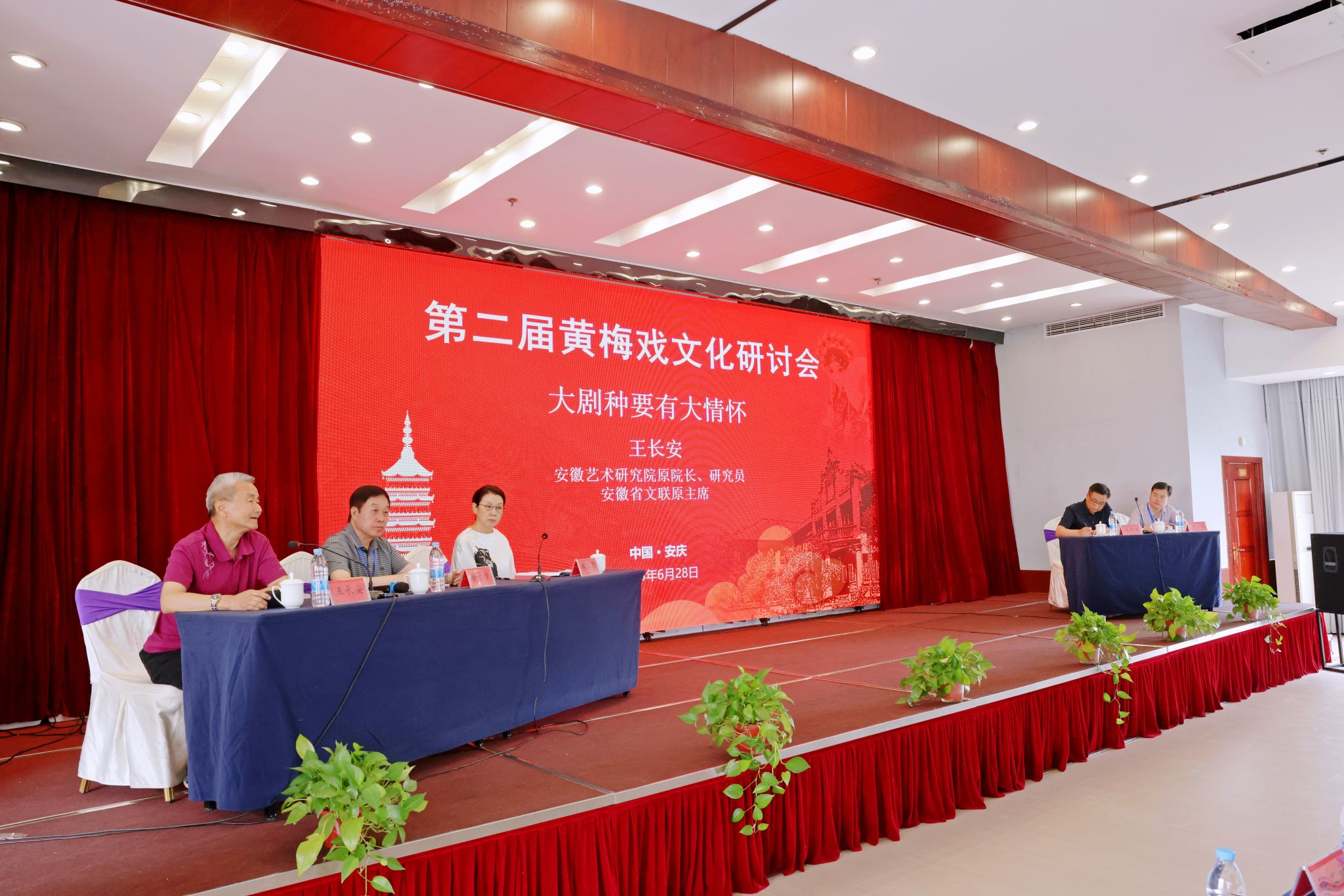 6月28日,学校主办第二届黄梅戏文化研讨会,深入学习贯彻习近平文化思想和习近平总书记考察安徽重要讲话精神,推动中华优秀传统文化创造性转化、创新性发展。安徽省政协党组副书记、副主席孙云飞,中共安徽省委教育工委委员、安徽省教育厅副厅长刘业勋,安徽省社会科学界联合会一级巡视员江涛,校党委书记李福华,校长彭凤莲,安庆市人民政府副市长李岩等出席开幕式。中国戏剧家协会、中共安徽省委宣传部、中共安庆市委宣传部和安庆市文化和旅游局,以及来自东南大学、同济大学、中国戏曲学院、中国音乐学院、山东艺术学院、华东师范大学、南京师范大学、福建师范大学、上海师范大学、信阳师范大学、温州大学、北方工业大学、广东财经大学、湖北演艺集团、河南省文化艺术研究院、安徽省艺术研究院、黄山学院、安徽黄梅戏艺术职业学院、安庆市黄梅戏(地方戏曲)研究院、安庆市文化旅游产业发展集团有限公司等机构的140多位领导、专家学者、演艺人员和企业界人士参加会议。李福华主持开幕式与闭幕式。