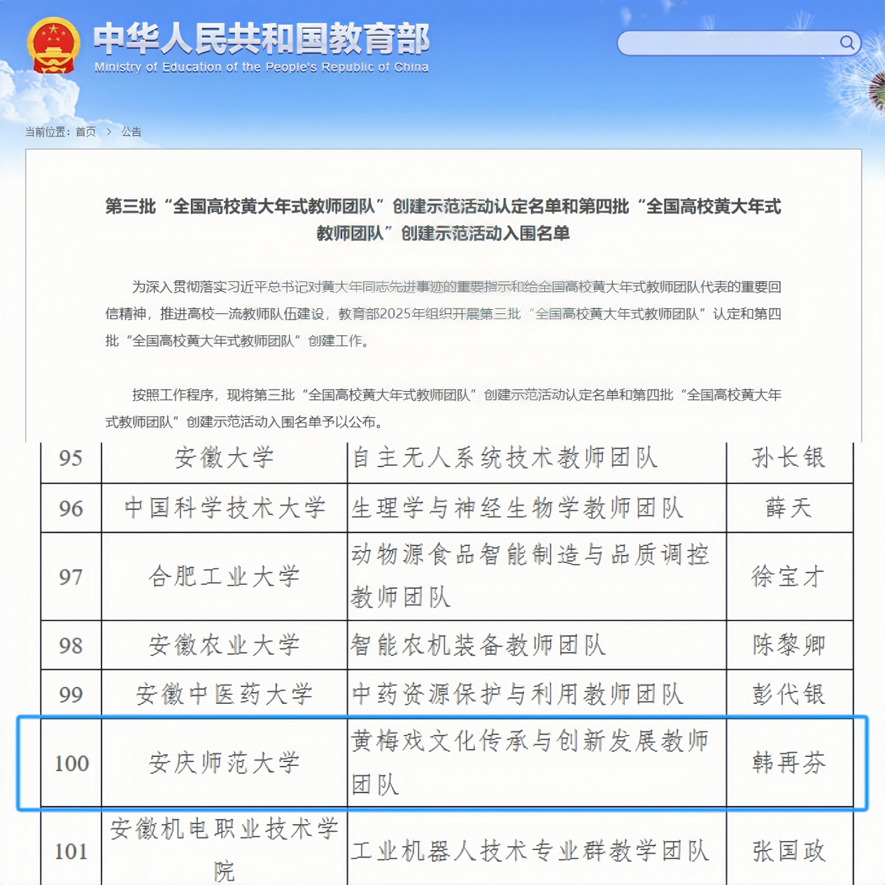 在第41个教师节来临之际,教育部公布第三批“全国高校黄大年式教师团队”创建示范活动认定名单和第四批“全国高校黄大年式教师团队”创建示范活动入围名单。beat365黄梅剧艺术学院韩再芬带领的“黄梅戏文化传承与创新发展教师团队”入选第四批“全国高校黄大年式教师团队”创建示范活动入围名单,成为beat365历史上首次入围此名单的教师团队。
