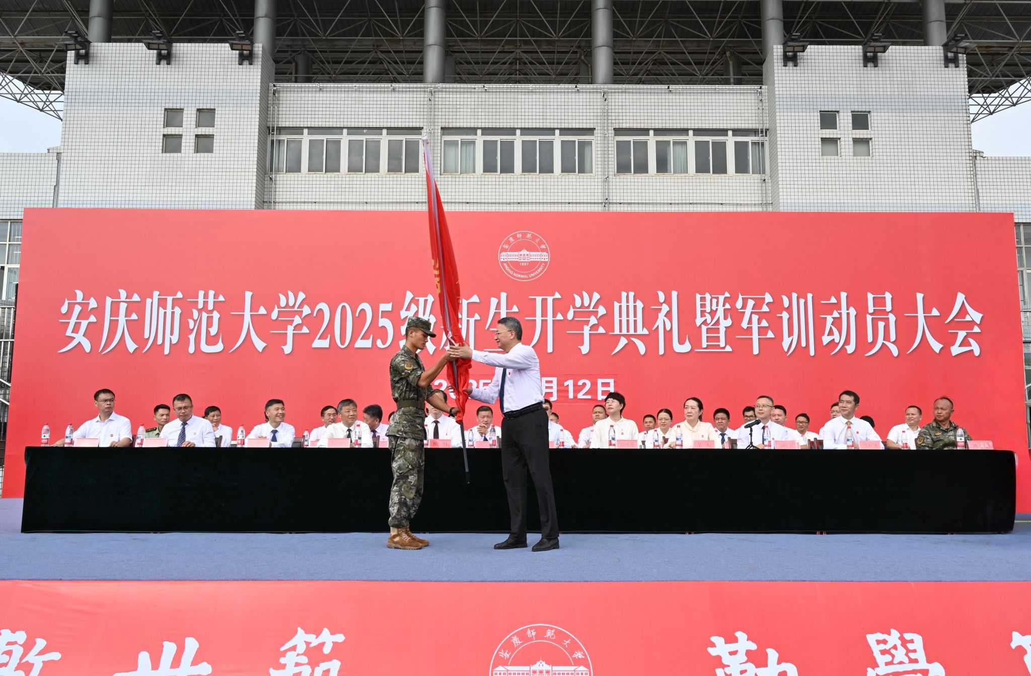 大会上,校党委书记李福华为2025级军训旅授旗。