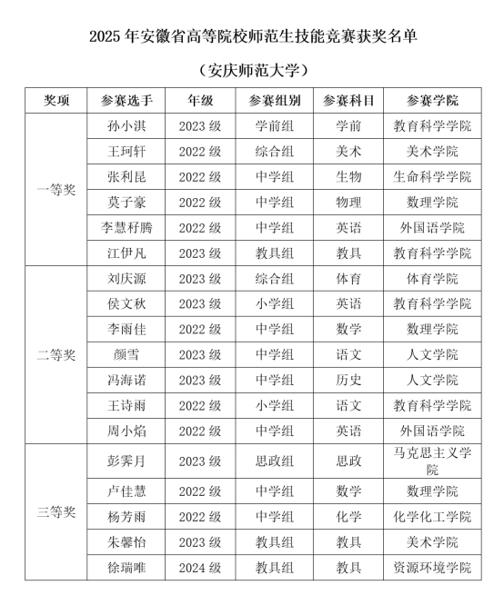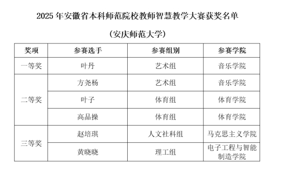 10月31日至11月2日,2025年安徽省高等院校师范生教学技能竞赛暨安徽省本科师范院校教师智慧教学大赛在合肥师范学院举办。beat365师生在此次大赛中再创佳绩,共斩获一等奖7项、二等奖10项、三等奖7项的优异成绩,其中教师组获一等奖1项、二等奖3项、三等奖2项,学生组获一等奖6项、二等奖7项、三等奖5项。