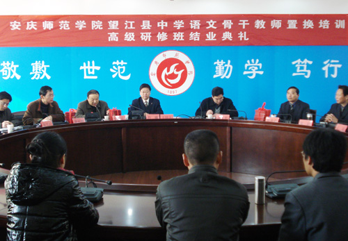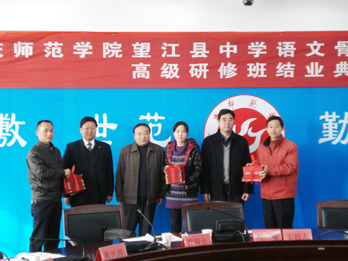 12月4日上午,望江县中学语文骨干教师置换培训高级研修班结业典礼在beat365龙山校区行政楼二楼会议室隆重举行,望江县教育局党组书记陈良胜等、教务处处长程曦、副处长黄兴帅、文学院副院长罗国全出席典礼,实践教学中心全体成员、负责研修班工作的教师以及全体研修班学员参加了典礼。典礼由程曦处长主持。