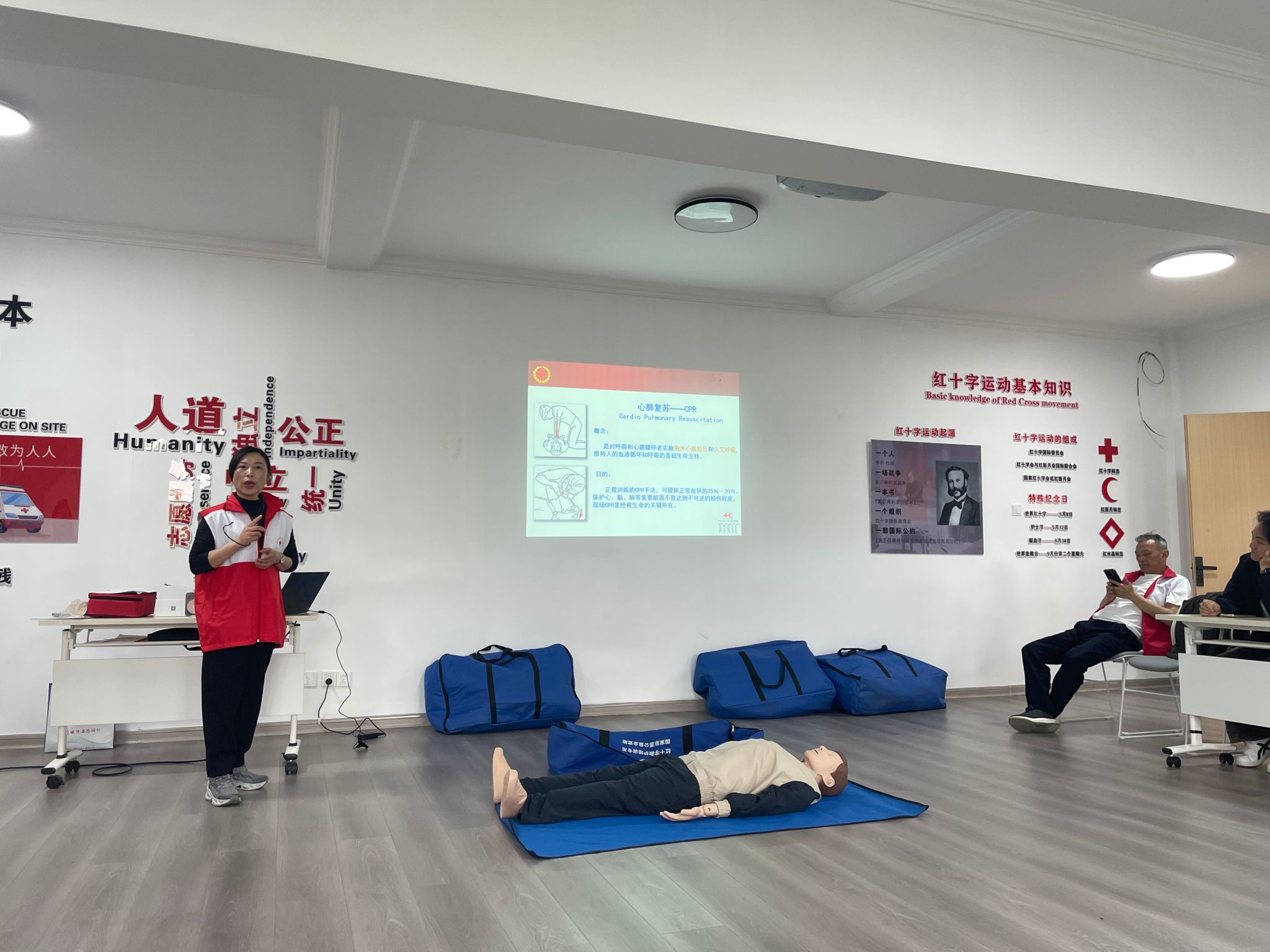 现场宣传活动中,宜秀区红十字应急救护员培训师严永跃深入讲解了红十字运动的起源、发展和重要意义,详细阐释了“三救三献”(救灾、救护、救助、献血、造血干细胞捐献、人体器官捐献)的核心内容,让大家对红十字事业有了更全面、更深刻的认识。技能培训阶段,专家以真实急救案例为切入点,强调“黄金四分钟”对挽救生命的关键作用。通过图文演示与视频讲解,系统阐释心肺复苏的完整流程:环境评估、胸外按压、人工呼吸、AED使用。在技能实操环节,参训学生分组利用人体模型进行CPR与AED联合操作演练。专业医护人员全程指导,逐一纠正按压姿势、吹气力度等细节,让学生掌握快速判断与精准施救的要领。