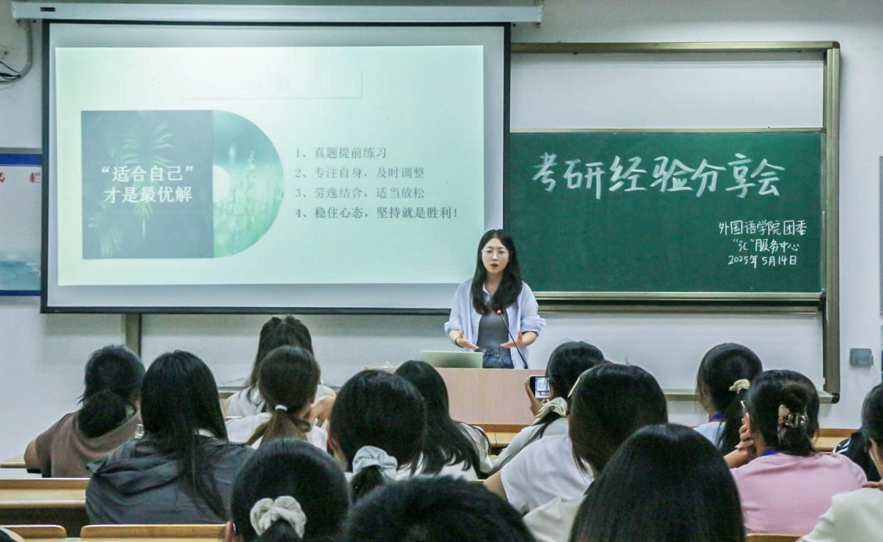 外国语学院一直高度重视学生考研工作,此次经验分享会旨在为同学们搭建学习交流平台,充分发挥优秀学子的榜样引领作用。通过本次分享会,同学们收获了实用的考研经验,对考研流程和备考方法有了更清晰的认识,也进一步坚定了考研信心。(撰稿:倪湘 樊陈慧 宋晚月 摄影:杨再冉 蒋雨轩 编辑:江伟 审核:何媛君 赵丽丽)