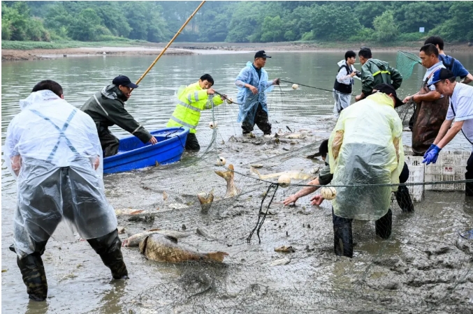 专业捕捞人员撒网收鱼,志愿者们捕捞搬运,一条完整的“生产链”正高效地运行着。“一共捕捞了600公斤左右不同种类的鱼,鲤鱼、鲶鱼、白鲢鱼……最大的一条足足有34.6斤。”志愿队负责人、生物科学专业2023(1)班的光莹坦言,刚抽干的湖底十分泥泞,加上一直在下小雨,给捕捞活动带来了很大不便,不少学生摔倒在泥里,但他们仍坚持着将捕鱼任务“漂亮”完成。