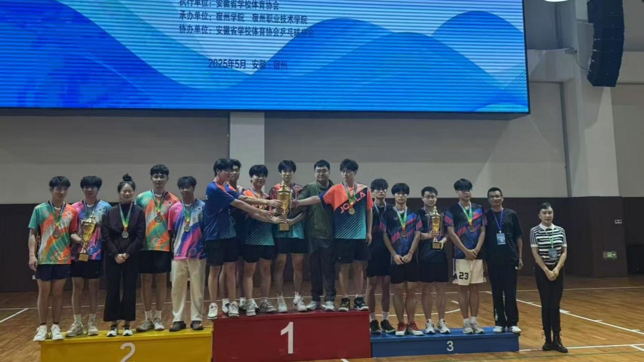 5月29日,2025年安徽省学生体育联赛大学生乒乓球比赛在宿州市落下帷幕。本次比赛由安徽省教育厅、安徽省体育局主办,宿州学院和宿州职业技术学院承办,共有来自全省63所高校的400余名运动员参赛。beat365乒乓球队由陈国元、黄安泉两位教师担任教练,带队出征,荣获1枚铜牌、1个二等奖、4个三等奖。