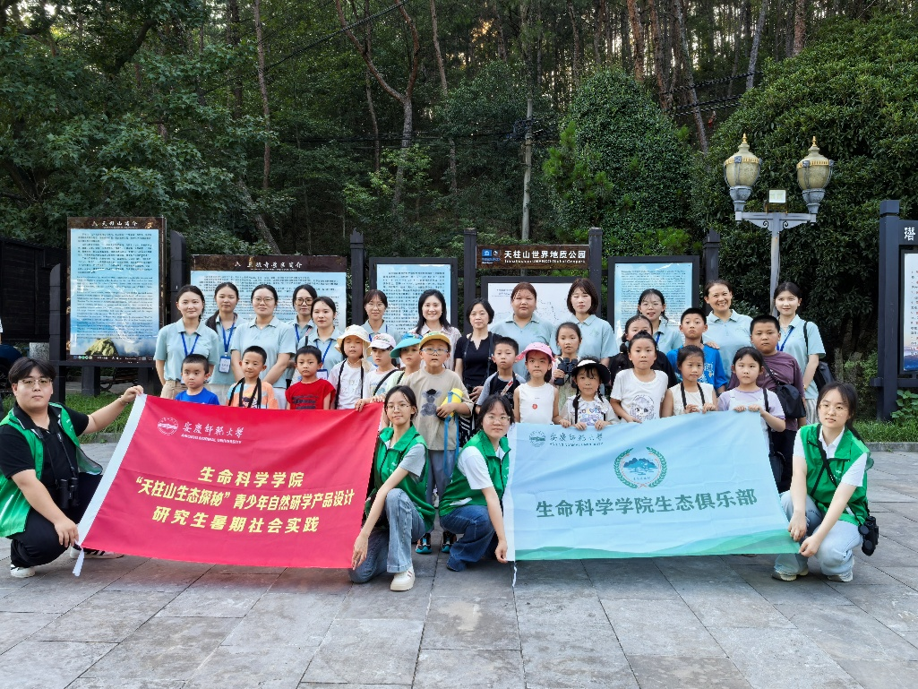 近日,生命科学学院师生走进潜山市天柱山研学基地,开展了“天柱山生态探秘”自然研学研究生暑期社会实践活动。活动结合天柱山世界地质公园及皖河湿地的自然资源,设计并实施了一系列科学探究与艺术创作相结合的课程,旨在提升青少年的生态文明素养,推动生态资源向教育载体转化。