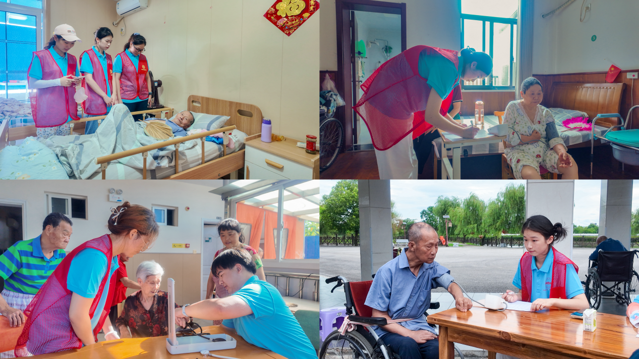 带着血压仪和调查问卷,团队成员依次前往三家养老机构。在养老院,团队成员先为老人测量血压,刚开始操作时显得有些紧张、无措,老人们和蔼、慈祥的面容让团队成员放松下来。他们“兵分两路”,身体硬朗能够自行活动的老人统一在大厅测量血压;而由于身体不便卧床的老人,成员们则轻手轻脚走进房间,俯身床边完成测量。三天时间里,从最初的手忙脚乱,到后来的驾轻就熟,每一次操作、每一次交流,都让团队成员在实践中飞速成长。