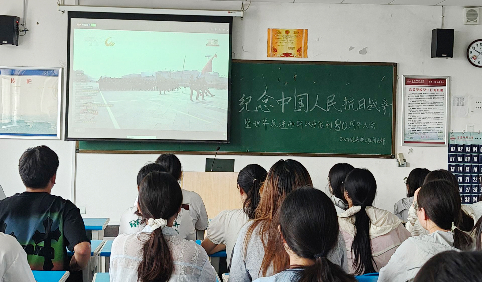 外国语学院党政领导、教师代表齐聚一堂,各班级团支部在责任教室集中观看纪念中国人民抗日战争暨世界反法西斯战争胜利80周年大会。屏幕上,天安门广场旌旗猎猎,长安街上受阅部队整齐列阵,新型武器装备首次亮相,展现了我国国防科技的飞速发展和国家实力的日益增强。师生们神情庄重、全神贯注,共同见证这一庄严时刻。直播结束后,师生们纷纷表示,阅兵盛典令人震撼,民族自豪感油然而生。