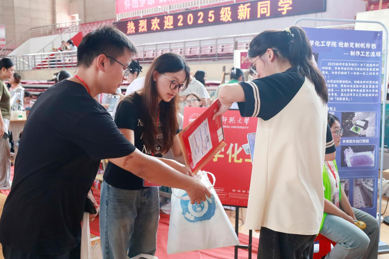 从校门口的清晰指引到军训服领取点的全程引导,从手作蓝晒包的惊喜递送到宿舍里的暖心问询……9月6日,化学化工学院师生用“专业特色+贴心服务”,为2025级新生铺就了一条从“初遇”到“安心”的大学迎新路。