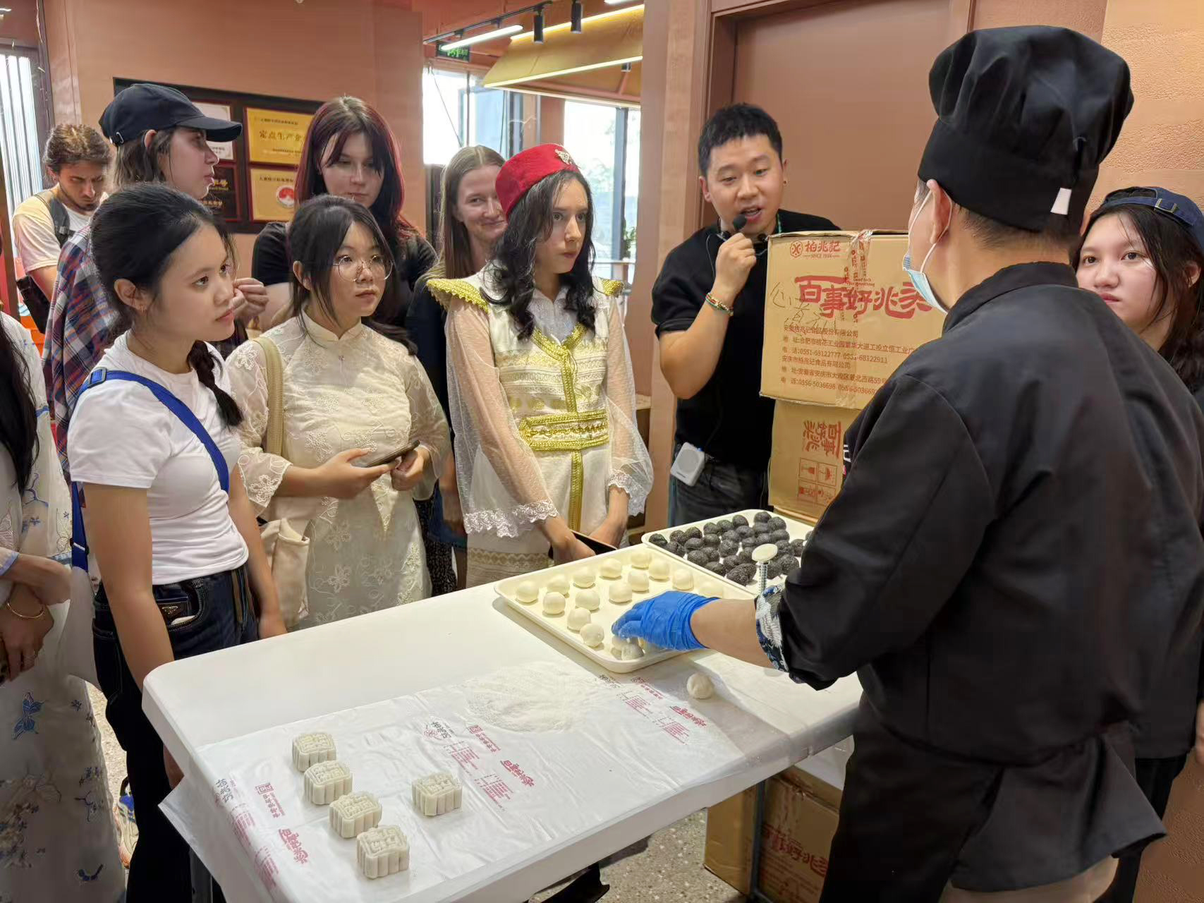 师生们随后来到大南门特色文化街道,领略临江古城的独特风貌和历史文化背景。在中华老字号“柏兆记”,师生们了解了中秋节的由来,并在省级劳动模范、第六代中华糕饼技艺传承人路四九师傅的指导下亲手制作月饼,通过实践对中秋节团圆的文化内涵有了更直观的理解。