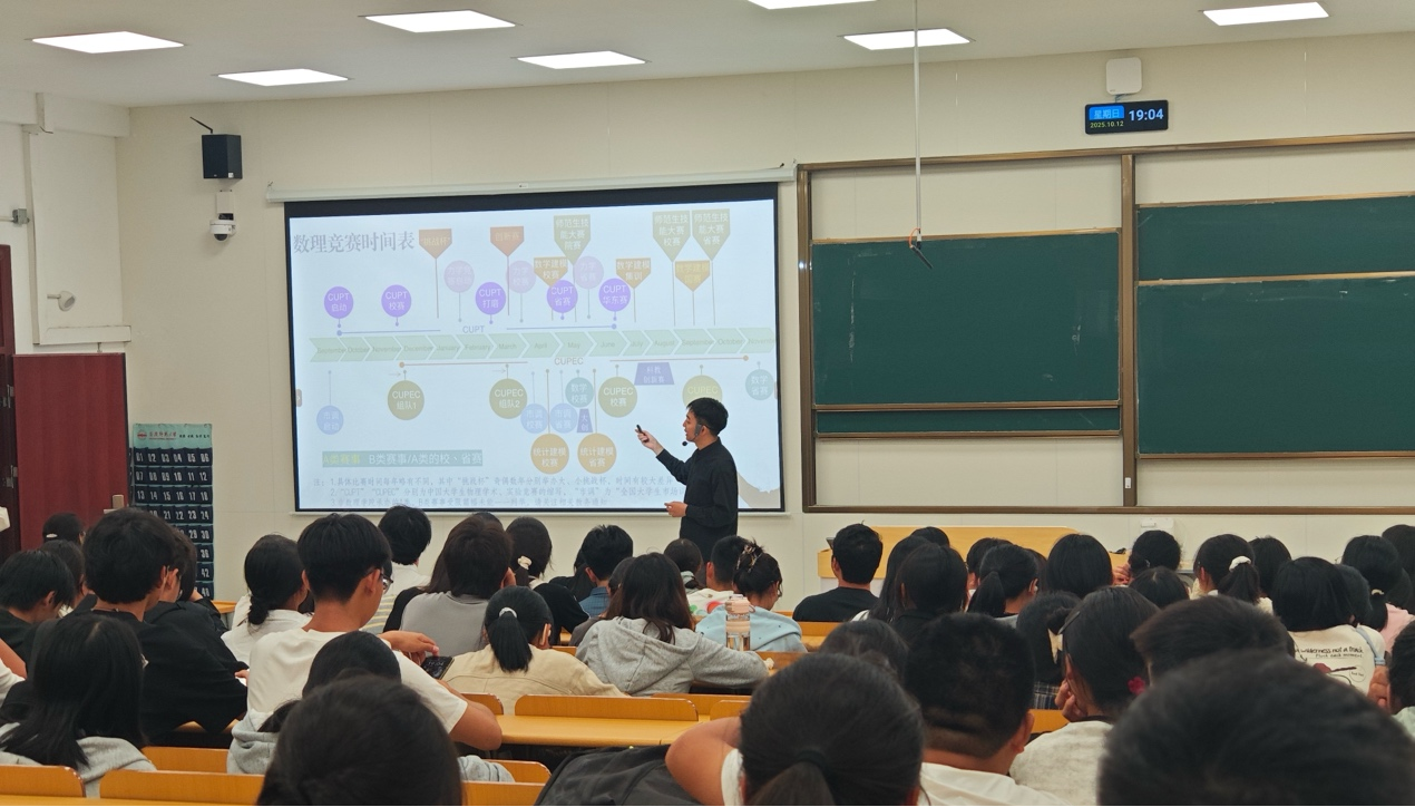 在“以赛为引”环节中,数理学院梁智雄老师详细介绍了数理类主要学科竞赛的内容、参赛意义以及校赛、省赛、国赛的时间安排,系统讲解了学院数理类竞赛的组织与支持体系。他鼓励同学们以CUPT为契机,勇于挑战自我,通过竞赛提升创新能力与团队协作水平,为今后的A类赛事打下坚实基础。