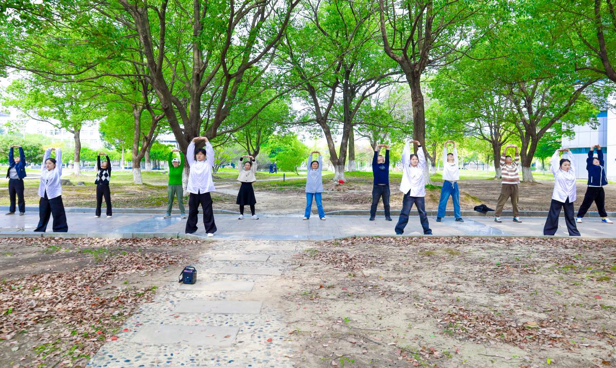 “平时在办公室坐得久,肩颈经常僵硬,练完一遍感觉整个人舒展多了。”校图书馆工作人员胡瑞老师一边活动着肩膀一边说:“以前只在电视里看过这些招式,今天跟着同学们学习,不仅掌握了动作,也体会到传统功法中特有的‘慢节奏’智慧。”她表示,这种传统功法无需高强度运动,通过舒缓的动作就能让身体逐渐放松,今后会和同事经常练习。