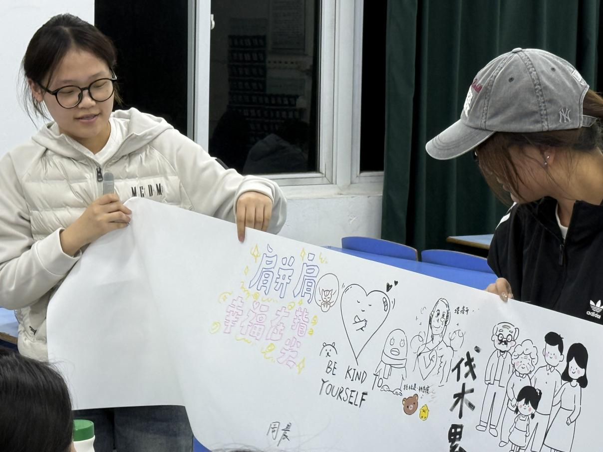 活动在“绘过往芬芳,绽未来锦绣”的共绘长画中拉开帷幕。现场提供的彩笔与长卷,成为了同学们表达情感的画布。在温柔的指导语引导下,大家沉静下来,回溯个人成长的长河,搜寻那些温暖的笑容、点亮心灵的话语或塑造自我的经历。各小组成员将这份源自“过去”的珍贵馈赠——一种精神、一份情感或一段记忆——转化为创作的灵感,共同挥洒色彩。一幅幅集体画作不仅是艺术的呈现,更是生命故事的汇聚。分享环节中,代表们动情地阐述构思,这份真诚的表达让在场每一位同学深切体会到,每个人的生命历程都是独特而美好的存在。