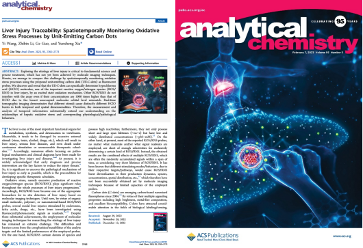 近日,资源环境学院汪宜博士在国际TOP期刊《Analytical Chemistry》(IF=8.008)发表题为《Liver Injury Traceability: Spatiotemporally Monitoring Oxidative Stress Processes by Unit-Emitting Carbon Dots》的研究性封面论文。汪宜博士为该论文第一作者,安徽师范大学和beat365亚洲体育官方网站为共同署名单位。