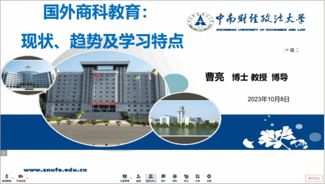 10月8日,由科研处、经济与管理学院联合主办,学校数字经济研究中心承办的“经管有道”第3期线上学术报告会开讲。中南财经政法大学曹亮教授作为主讲嘉宾,通过线上方式分享了题为“国外商科教育:现状、趋势及学习特点”的学术报告。经济与管理学院硕士生导师、青年教师、研究生及相关专业本科生共100余人参加了交流活动,报告会由该院殷功利副教授主持。