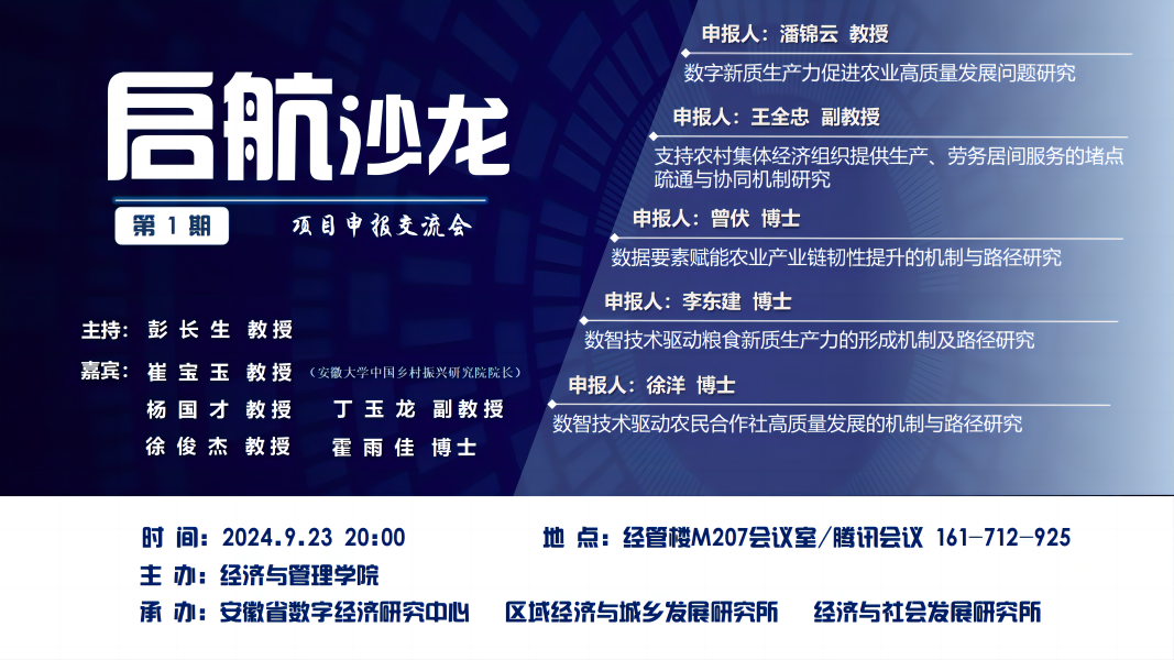 为进一步提升国家基金申报组织水平,营造全年开展、全员参与、全程跟踪的常态化辅导体系,9月23日,由经济与管理学院策划创建的品牌活动“启航沙龙”顺利举办。首期沙龙由安徽省数字经济研究中心、区域经济与城乡发展研究所、经济与社会发展研究所联合承办,安徽大学中国乡村振兴研究院院长崔宝玉教授作为特邀嘉宾参与交流,沙龙由彭长生教授主持。