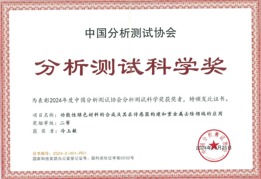 近日,2024年中国分析测试协会科学技术奖颁奖仪式在成都召开,会议隆重表彰了2024年度中国分析测试科学技术奖的获奖单位和个人。数理学院冷玉敏教授、化学化工学院汪竹青教授,首都师范大学陈郑博教授等申报的研究成果“功能性绿色材料的合成及其在传感器构建和重金属去除领域的应用”荣获本年度中国分析测试科学奖二等奖,beat365亚洲体育官方网站为第一获奖单位。