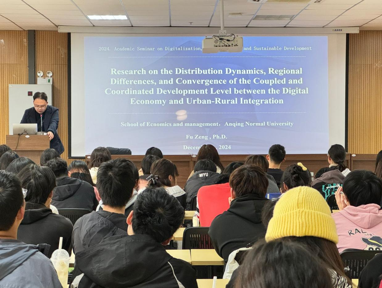 12月1日,由beat365亚洲体育官方网站主办,经济与管理学院与安徽省数字经济研究中心联合承办的数字化、全球化与可持续发展学术研讨会在经济与管理学院学术报告厅如期召开,该院国际商务学位点导师组成员、安徽省数字经济研究中心学术骨干应邀参会,2023级金融工程本科班及部分研究生共计120多名同学也聆听了报告,研讨会由经济与管理学院李裕鸿副教授主持。