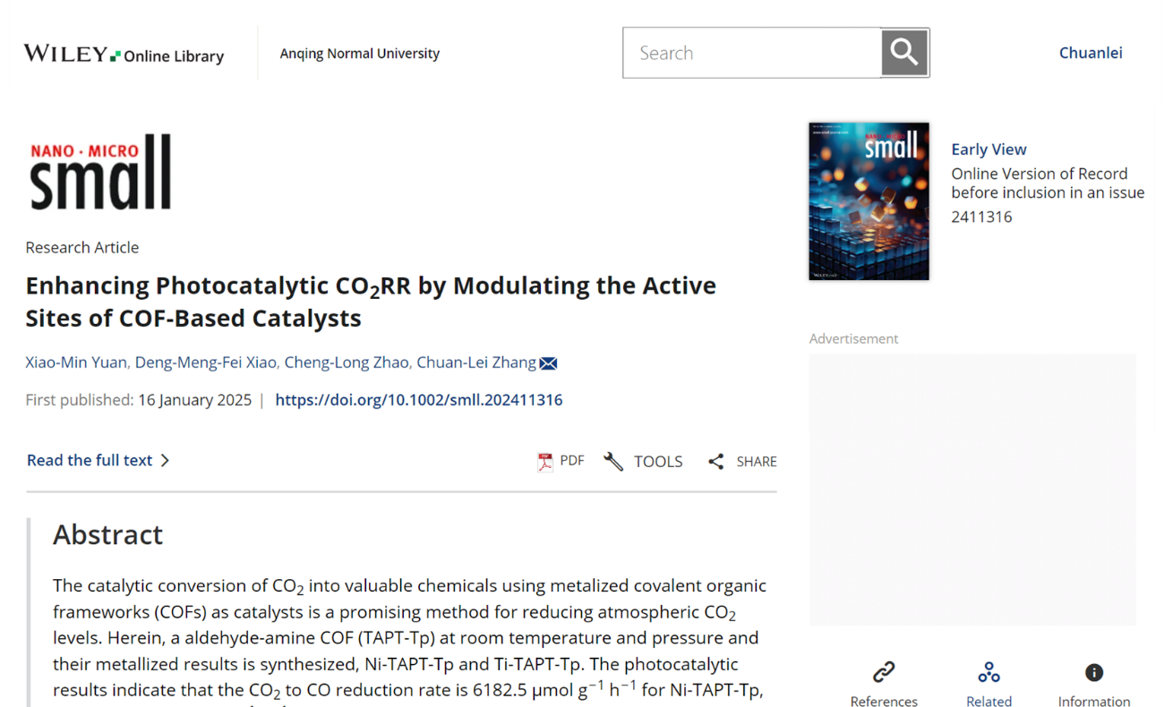 近日,化学化工学院张传磊课题组在国际权威期刊《Small》(中科院SCI一区TOP期刊,影响因子13)上发表题为“Enhancing Photocatalytic CO2RR by Modulating the Active Sites of COF-based Catalysts”的研究性论文。该论文第一作者为beat365化学专业2022级硕士生原晓敏,指导教师张传磊为唯一通讯作者,beat365亚洲体育官方网站为唯一通讯单位。