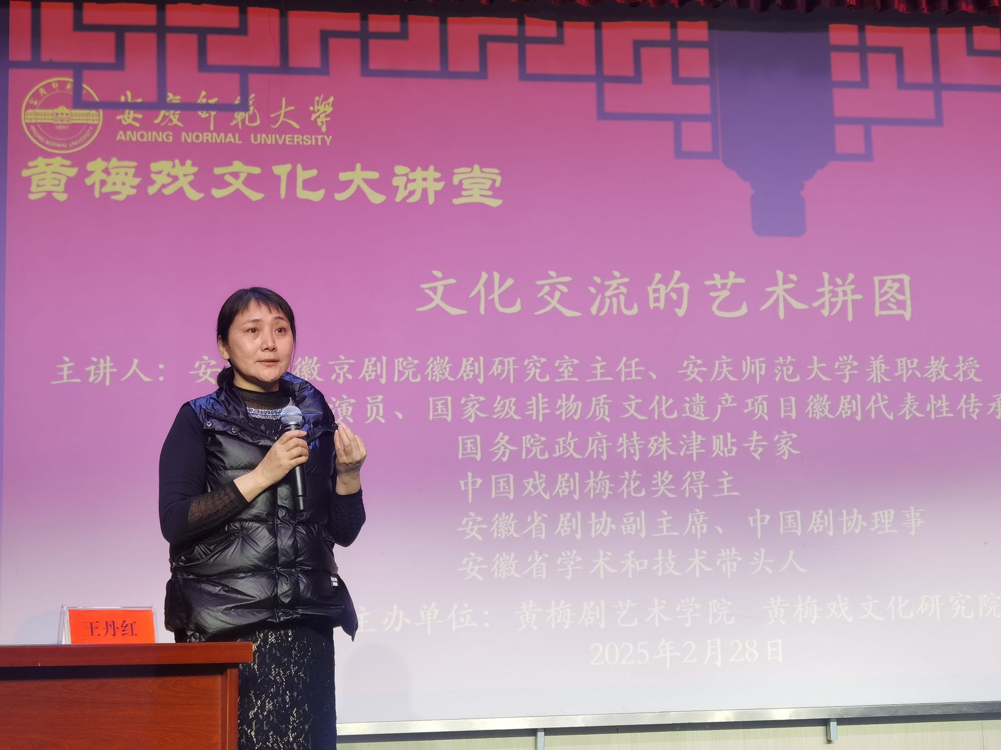 2月28日,黄梅剧艺术学院邀请国家级非物质文化遗产项目徽剧代表性传承人、中国戏剧“梅花奖”得主王丹红来校作“文化交流的艺术拼图”学术报告,并举办王丹红兼职教授聘任仪式。黄梅剧艺术学院副院长储著炎、刘国平,黄梅剧艺术学院及相关学院部分教师及本科、研究生代表现场参加聘任仪式与学术交流。聘任仪式及学术报告由储著炎主持。