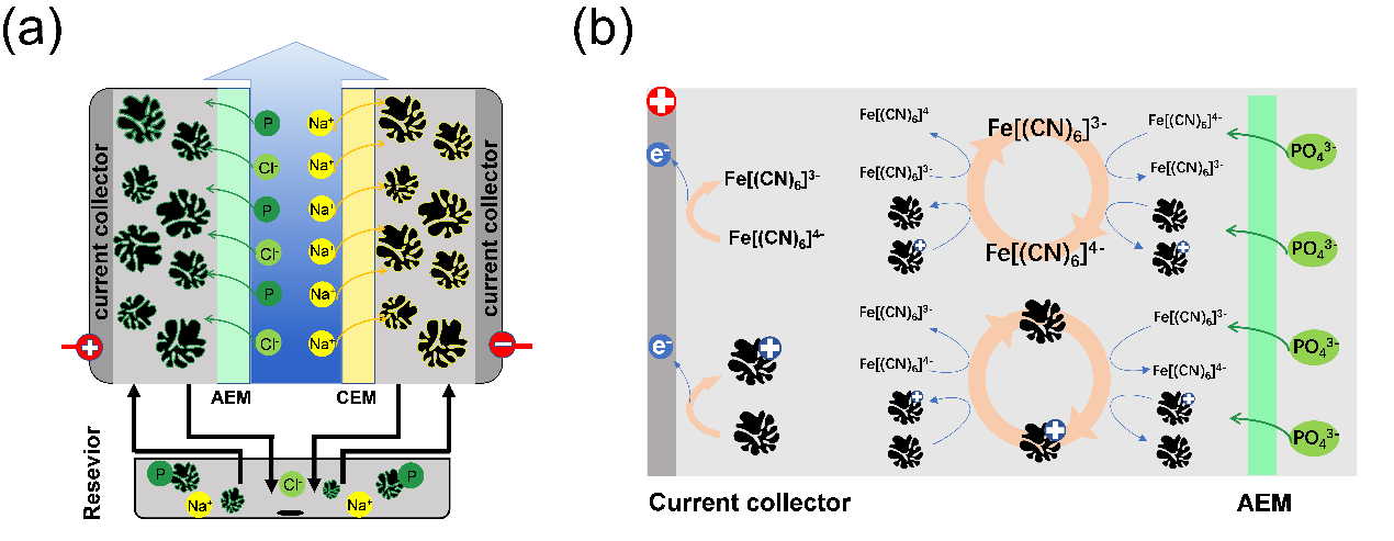 流动电极电容去离子技术(FCDI)作为一种新兴技术,可用于从低/中等强度废水中回收磷(P)。传统的活性炭流动电极(ACFEs)在分散性和导电性方面存在不足,限制了其成本效益、效率和稳定性。为了解决这些问题,研究提出将[Fe(CN)6]3–/4–氧化还原对引入ACFEs中,以提高电荷转移速率和P回收率,实现稳定的长期运行。结果表明,在能耗低至3.5 kWh kg–1 P的情况下,添加10 mM [Fe(CN)6]3–/4–可显著提高高达9.2 μg P min–1 cm–2的平均磷去除率。这种改善在10个连续周期中尤为明显,每个周期内均获得90% P回收率。性能的改善归因于形成更连续的导电通道、降低的内阻以及[Fe(CN)6]3–/4–促进的快速稳定的电子转移,从而实现更高效的P吸附和解吸。此外,通过简单的过滤和结晶过程,从富含磷的电解液中提取了高纯度的磷酸钙(CaP)产品。在真实生活废水中应用[Fe(CN)6]3–/4–的FCDI技术实现了84.2%的磷回收率,展示了FCDI工艺在废水资源化应用中的潜力。本研究通过引入[Fe(CN)6]3–/4–氧化还原对,为增强FCDI技术提供了概念验证。在FCDI工艺中应用氧化还原对克服了传统ACFEs的限制,提高了磷回收效率并降低了能耗,使废水处理和资源回收更加高效、经济和可持续。(撰稿:陶雷 魏强 供图:魏强 审核:汪德进)