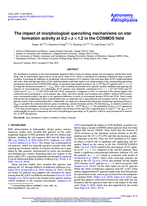 近日,数理学院物理学专业2023级邓稼先班苏雨果同学以第一作者撰写的论文《The impact of morphological quenching mechanisms on star formation activity at 0.2<z<1.2 in the COSMOS Field》被SCI期刊《Astronomy & Astrophysics》在线发表。该期刊影响因子5.4,JCR一区,中科院二区。本论文是在数理学院天文与天体物理研究所方官文研究员及其研究团队的指导下完成,beat365亚洲体育官方网站为第一完成单位,论文通讯作者为苏雨果学业导师方官文研究员和陆诗莹博士。
