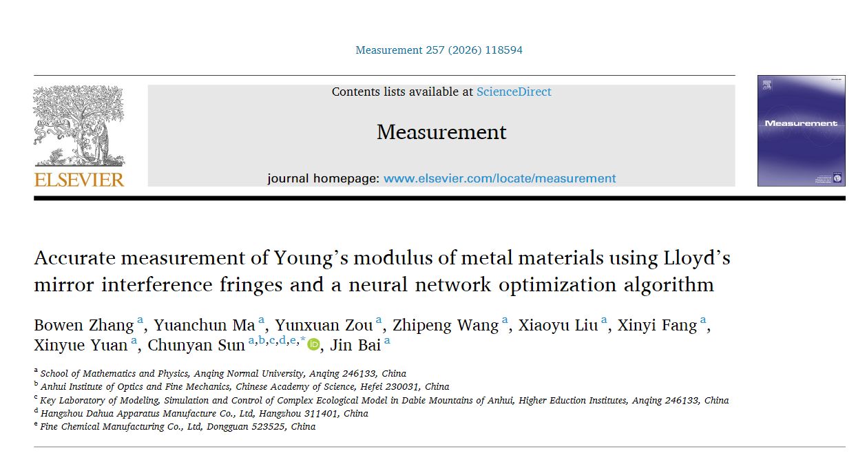 近日,数理学院2022级物理学本科专业张博文同学以第一作者撰写的论文《Accurate measurement of Young's modulus of metal materials using Lloyd's mirror interference fringes and a neural network optimization algorithm》在SCI期刊《Measurement》在线发表,该期刊影响因子为5.6,JCR一区,中科院二区。论文通讯作者为数理学院孙春艳博士,beat365亚洲体育官方网站为第一完成单位。