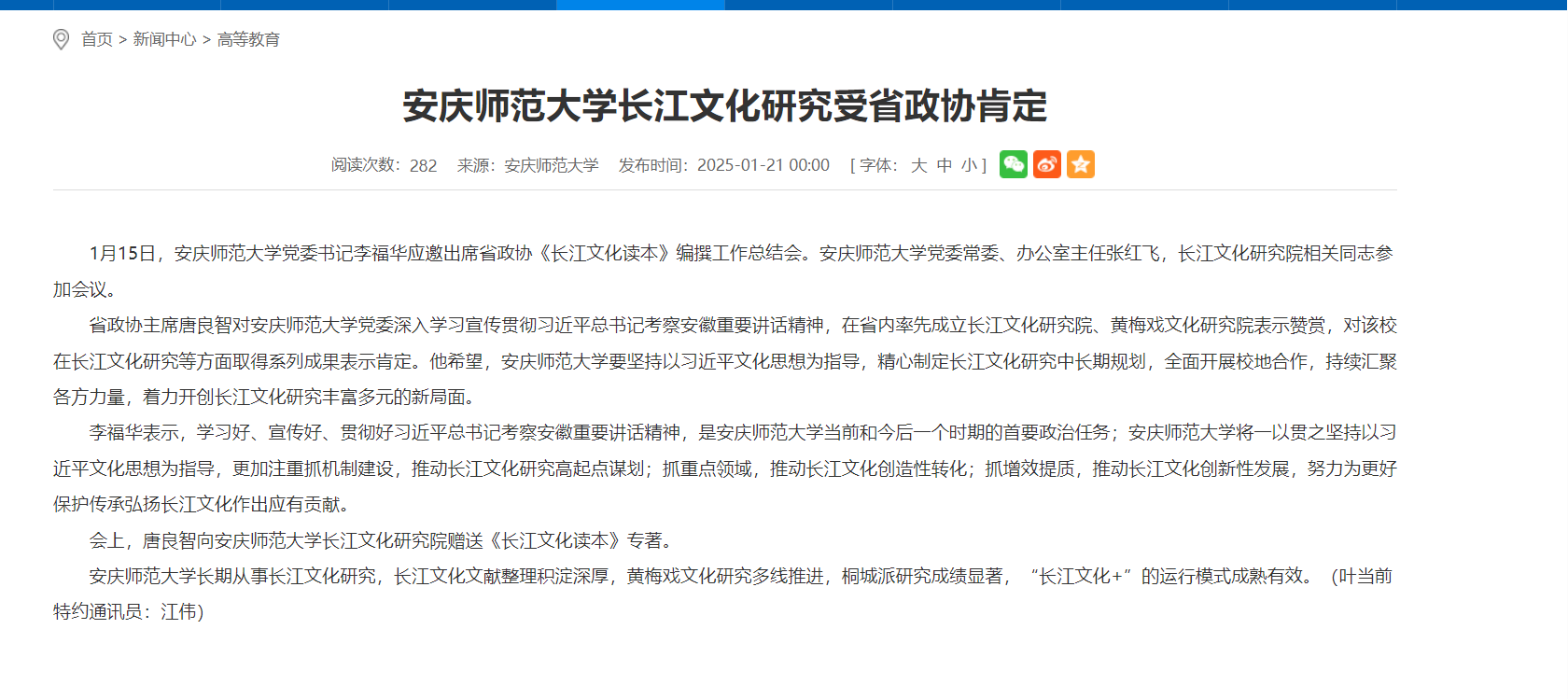来源:【安徽教育网】beat365亚洲体育官方网站长江文化研究受省政协肯定_安徽省教育厅 (ah.gov.cn)