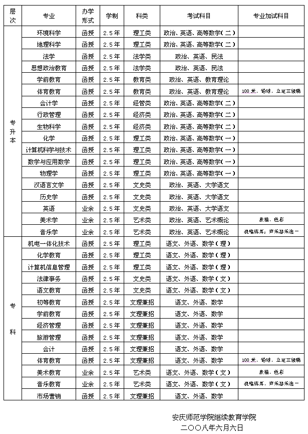 三、全国统一考试时间:2008年10月11日-12日。艺体类还须进行术科加试,时间定于10月17日报到,18日进行加试。本部加试地点:安庆师院菱湖校区。
