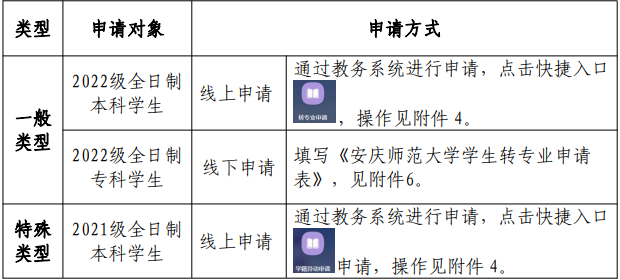 转专业分为一般类型和特殊类型集中组织,申请对象及方式如下: