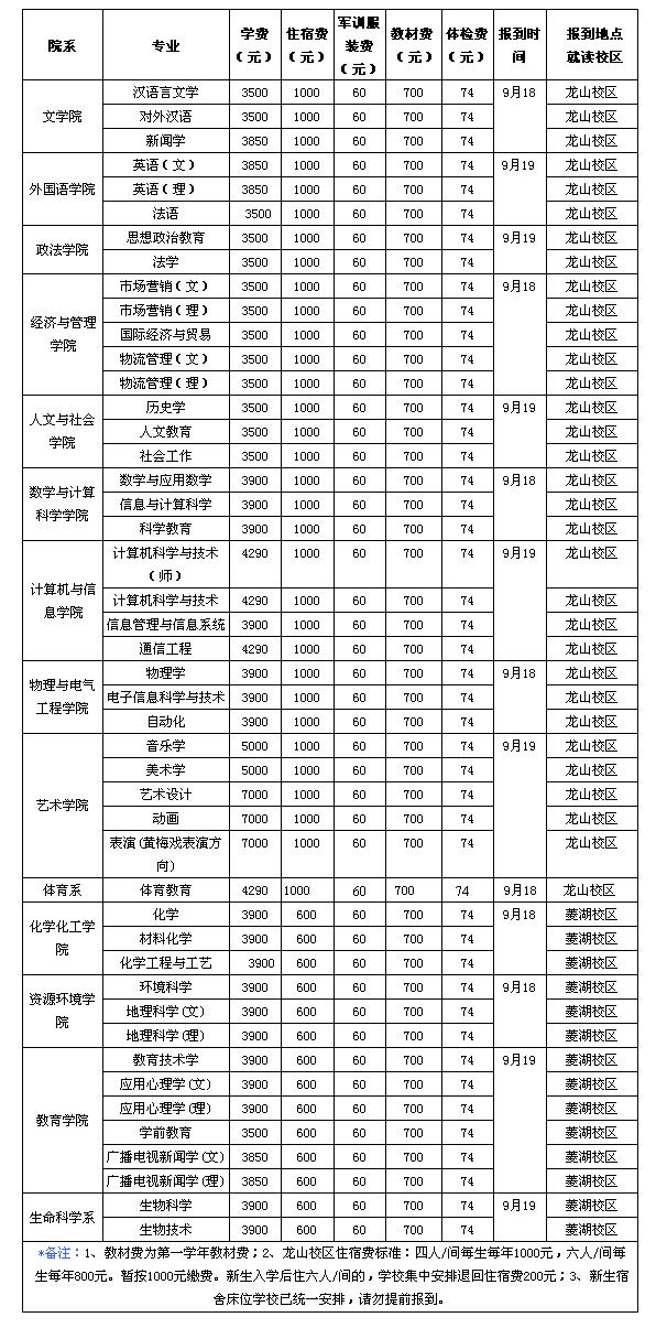 三、各专业新生具体报到时间、地点及缴费标准详见《安庆师范学院2007级本科新生报到及缴费标准一览表》。