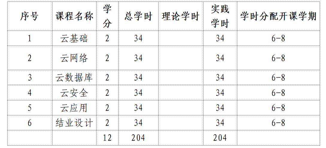 云计算应用微专业课程设置及教学进程计划表