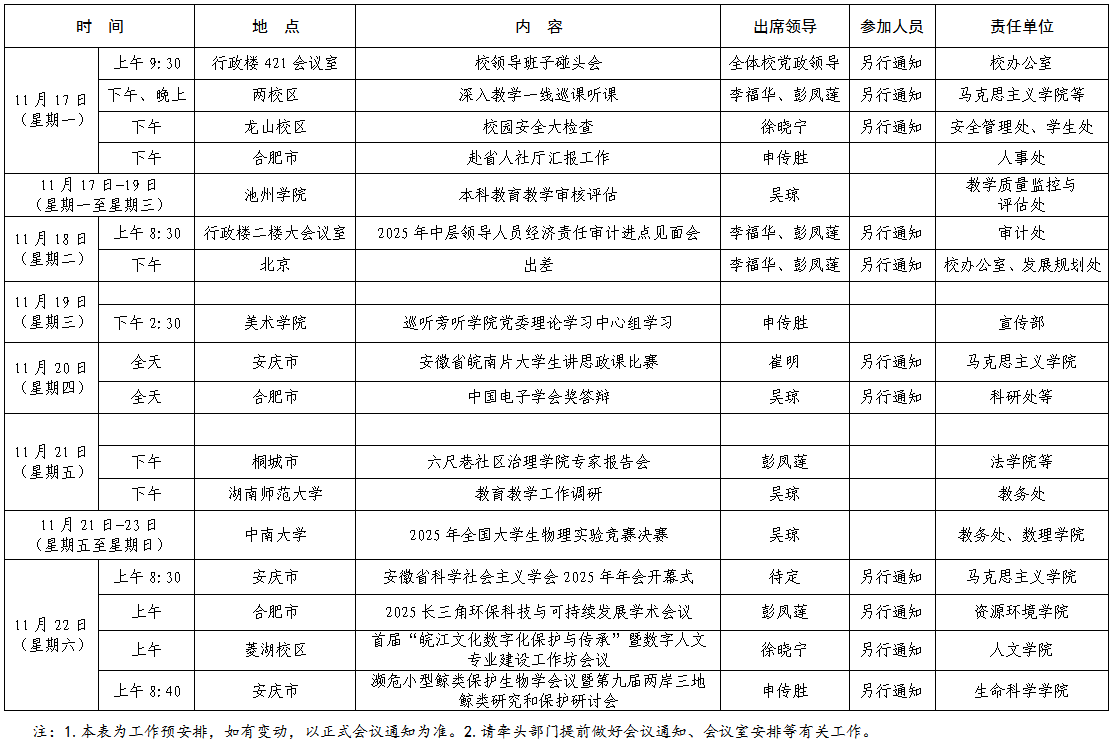 校党政领导2025年秋季学期第12周主要工作安排