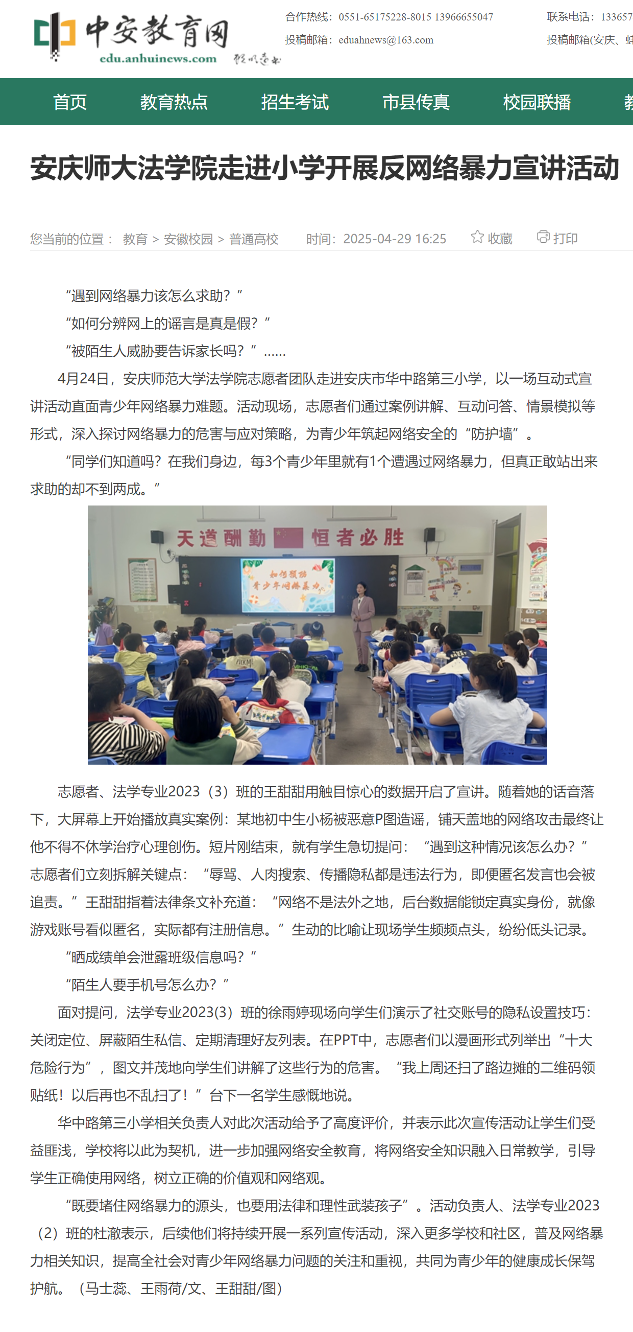 上一篇:安徽新闻网:预防网络暴力 共建阳光校园 安庆师大法学院走进小学开展反网络暴力宣讲活动