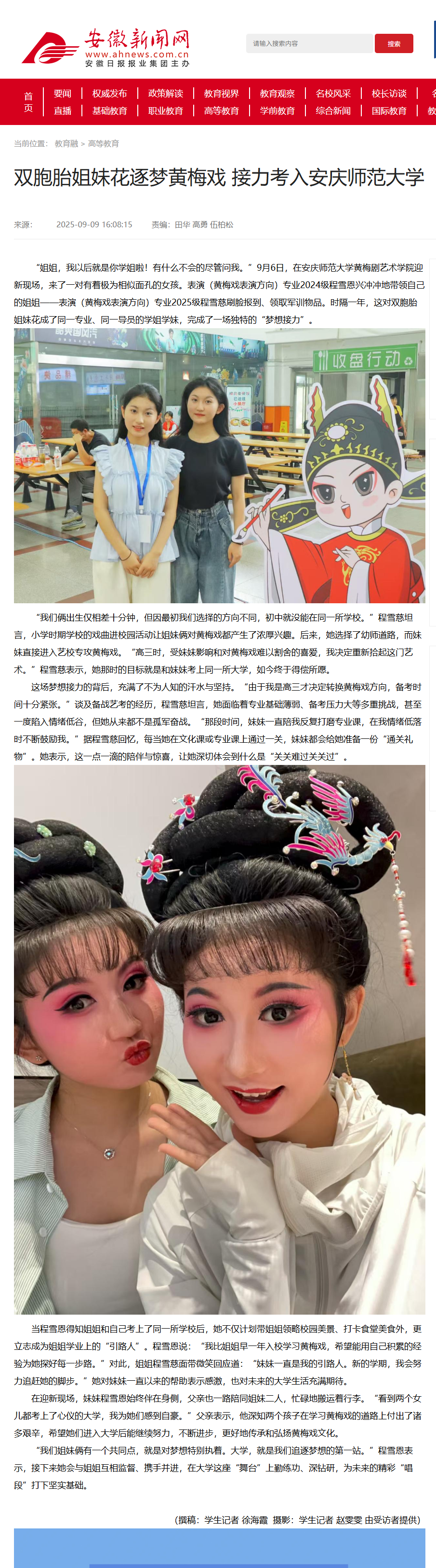 【安徽新闻网】双胞胎姐妹花逐梦黄梅戏 接力考入beat365亚洲体育官方网站http://xxt.ahnews.com.cn/news/2025/09/09/c_40171.htm