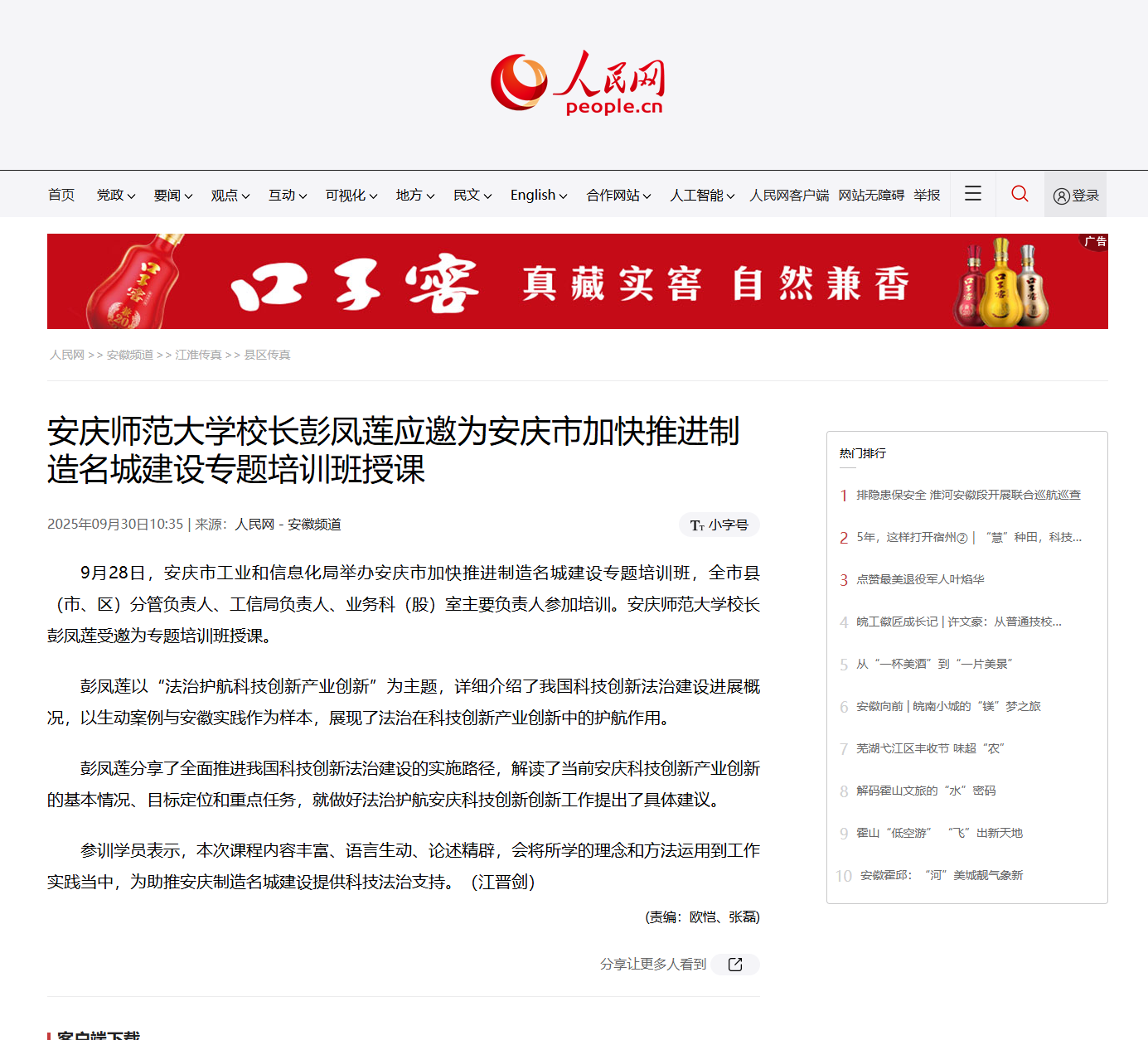 【人民网】beat365亚洲体育官方网站校长彭凤莲应邀为安庆市加快推进制造名城建设专题培训班授课http://ah.people.com.cn/n2/2025/0930/c374164-41369723.html