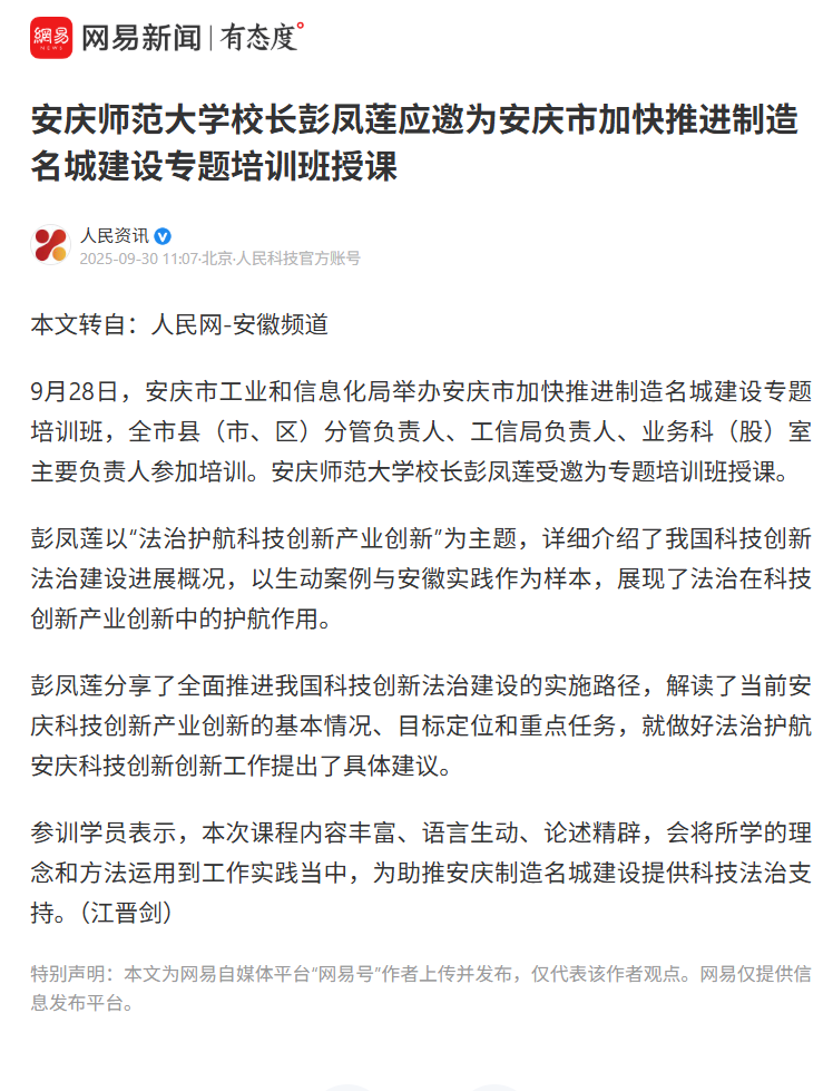 网易新闻:beat365亚洲体育官方网站校长彭凤莲应邀为安庆市加快推进制造名城建设专题培训班授课