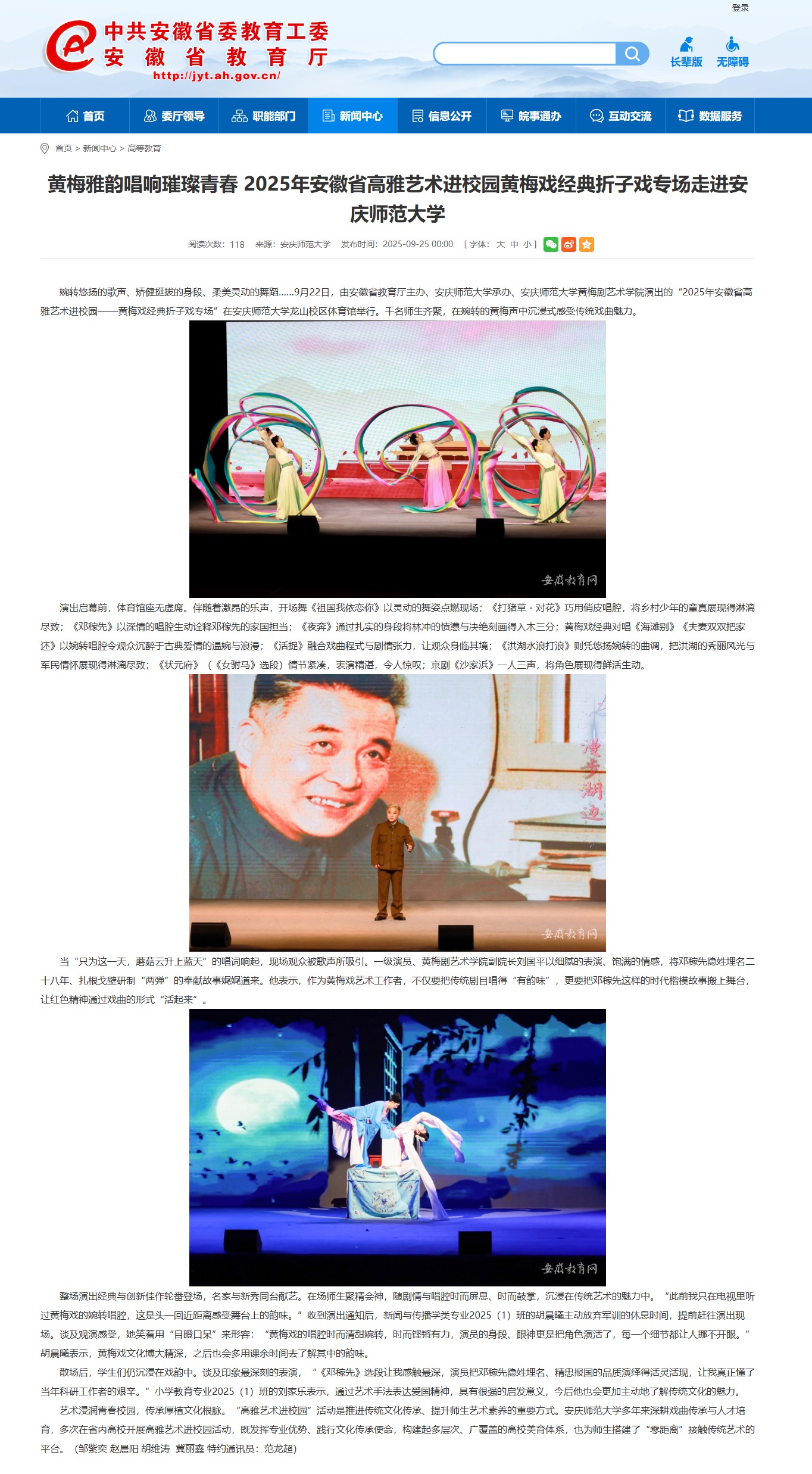 安徽教育网:黄梅雅韵唱响璀璨青春 2025年安徽省高雅艺术进校园黄梅戏经典折子戏专场走进beat365亚洲体育官方网站