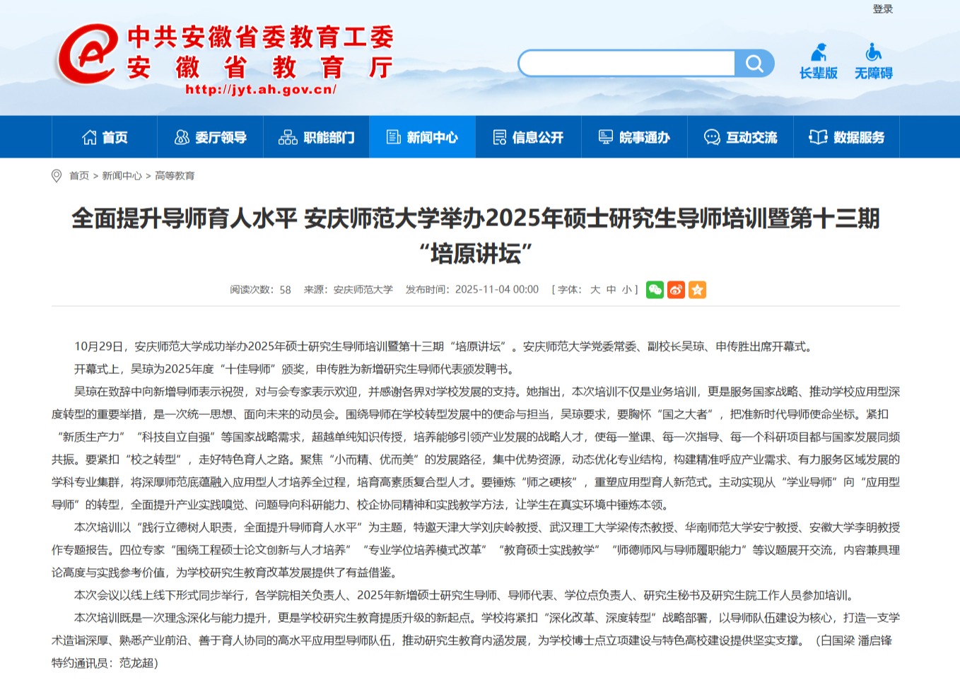【安徽教育网】全面提升导师育人水平 beat365亚洲体育官方网站举办2025年硕士研究生导师培训暨第十三期“培原讲坛”https://jyt.ah.gov.cn/xwzx/gdjy/40771467.html
