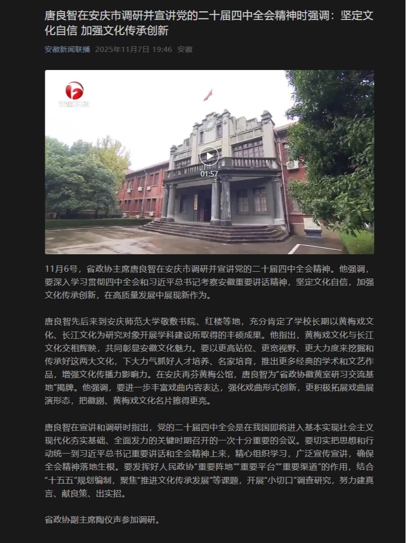 【安徽新闻联播】唐良智在安庆市调研并宣讲党的二十届四中全会精神时强调:坚定文化自信 加强文化传承创新https://mp.weixin.qq.com/s/M2KNWJAo0NzlAUF8mYhD6Q